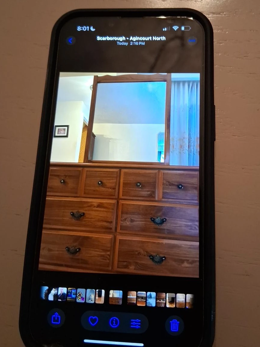 10This is a lovely wooden dresser with a mirror. It has a lot of drawers for storage. The dresser appears to be in good condition.