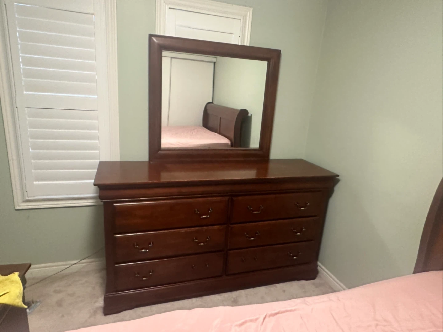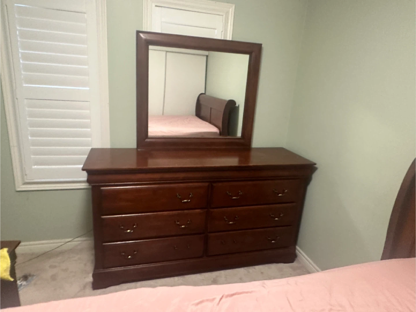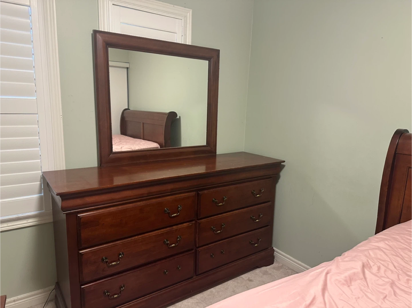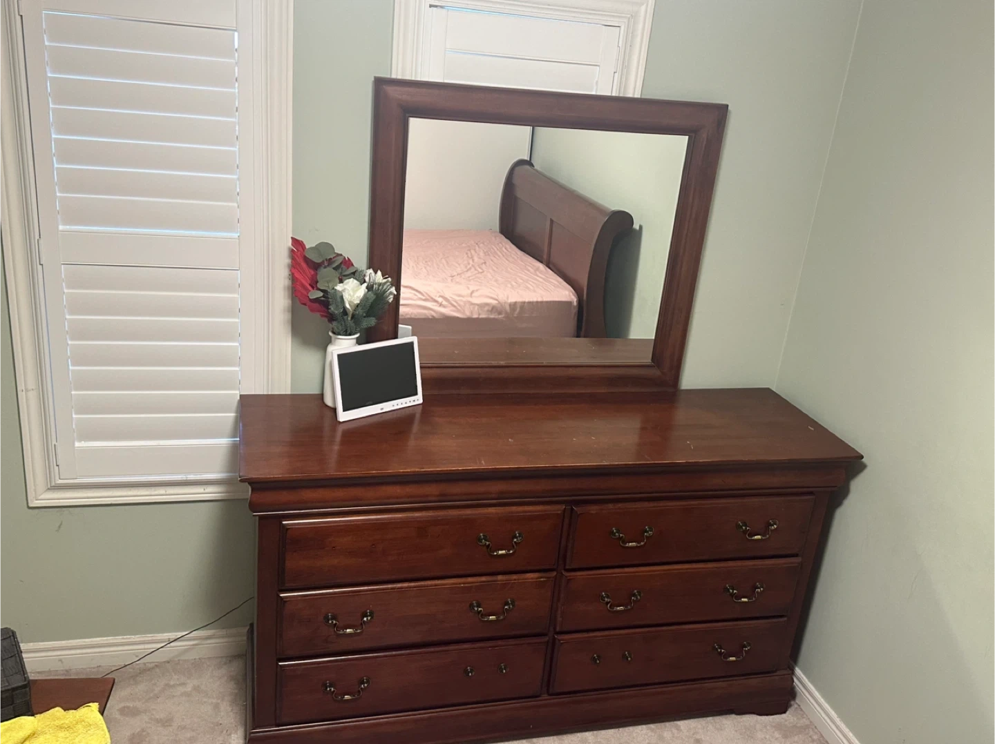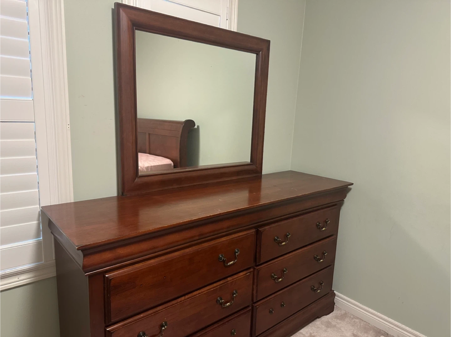 Selling a wood dresser with a mirror. It's a nice, solid piece of furniture. It has six drawers for plenty of storage. The dresser has a dark wood stain giving it a vintage look making it a beautiful yet useful add to any room.