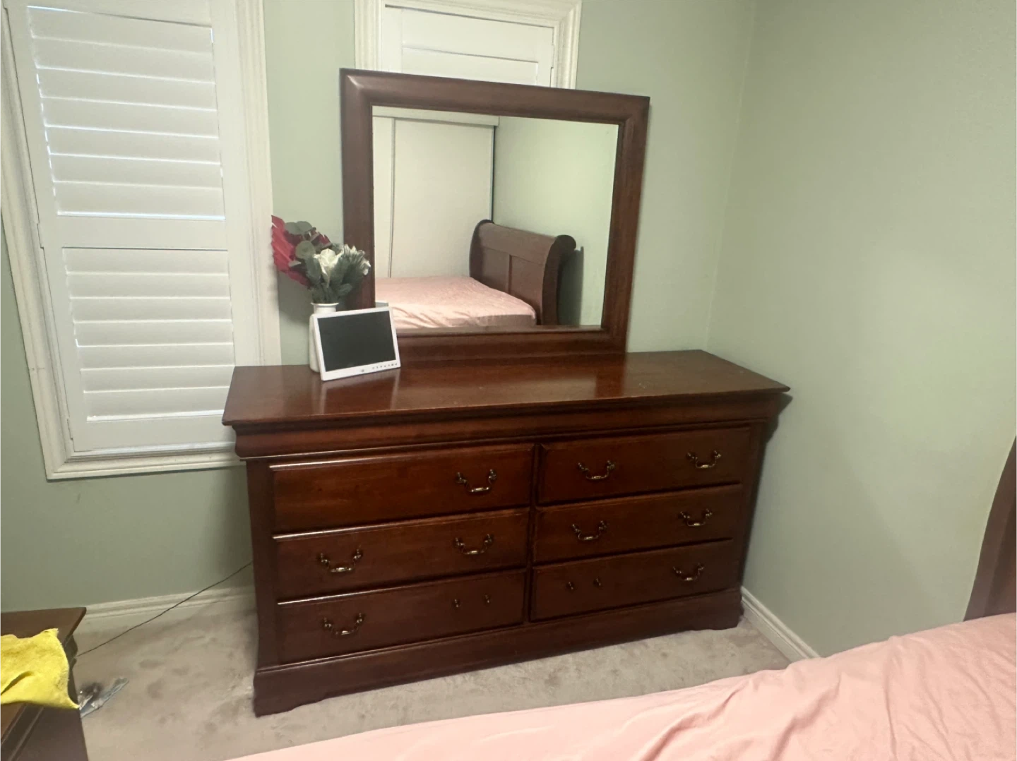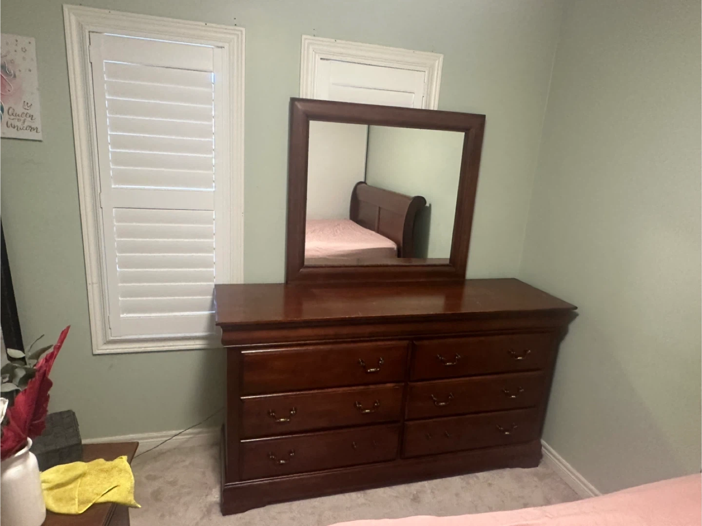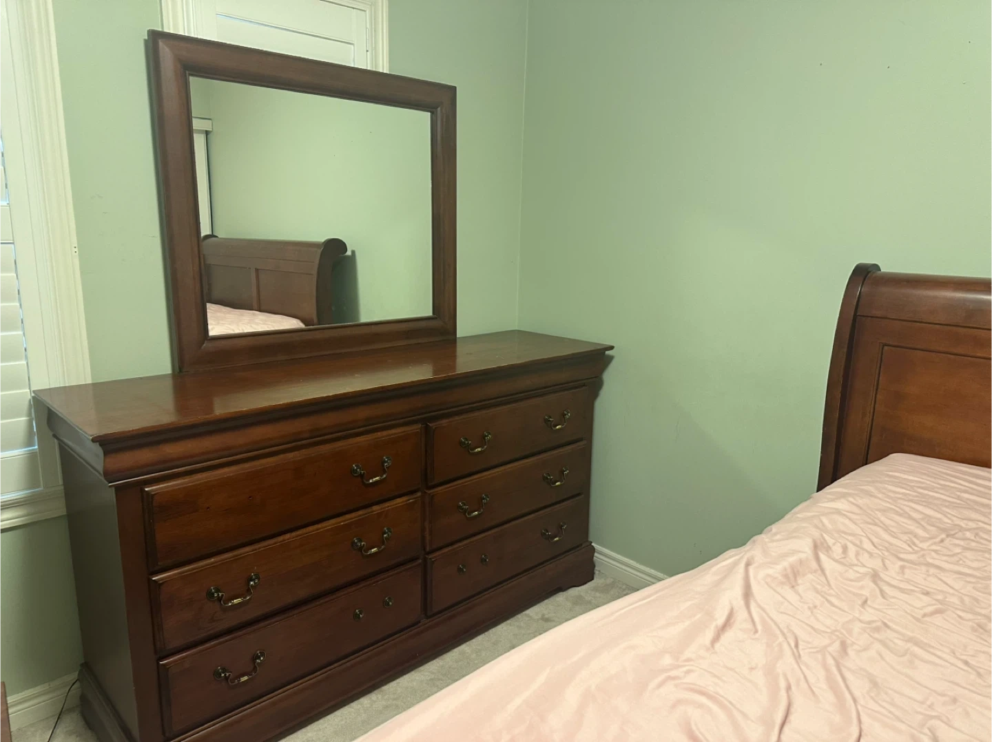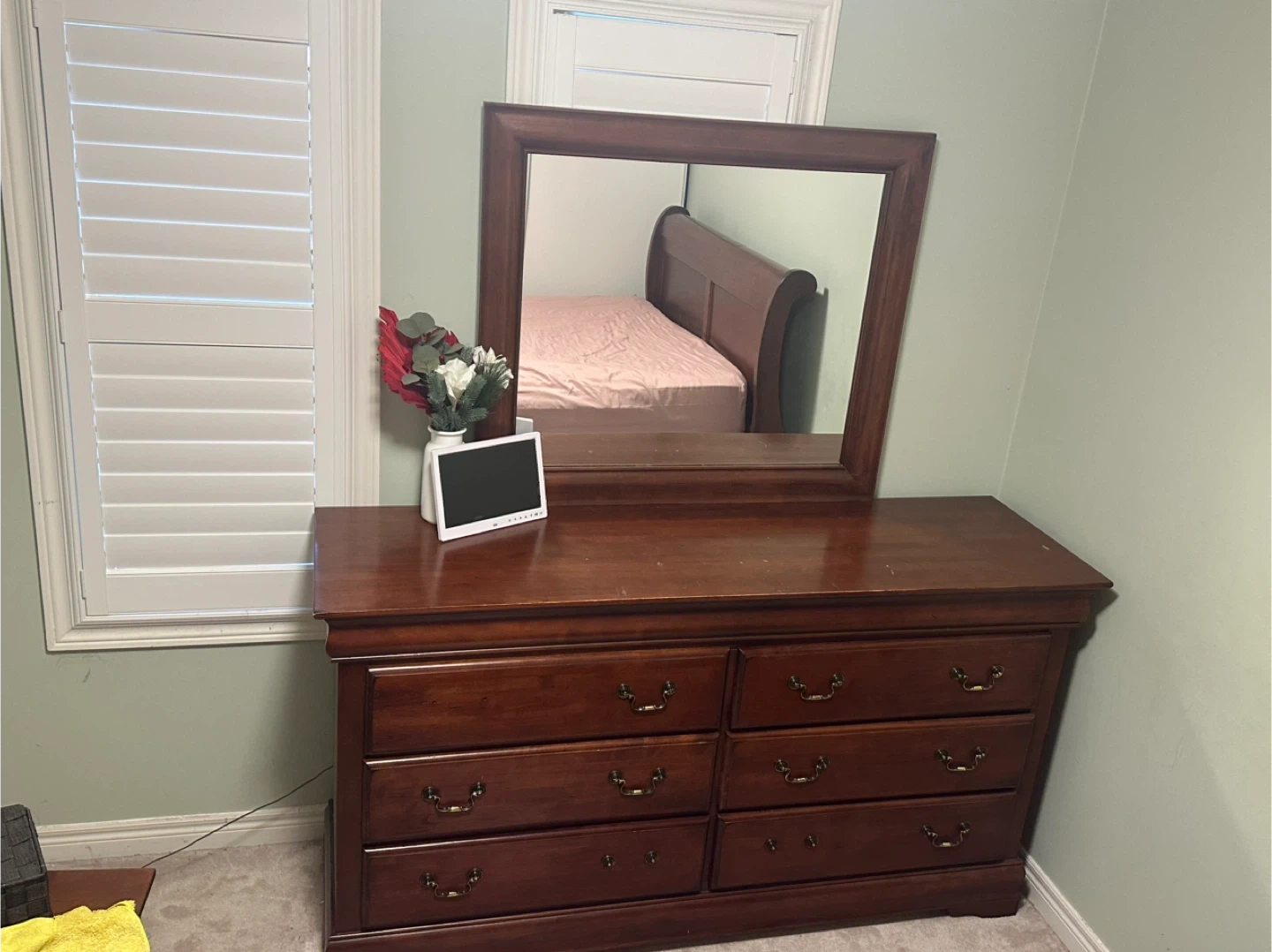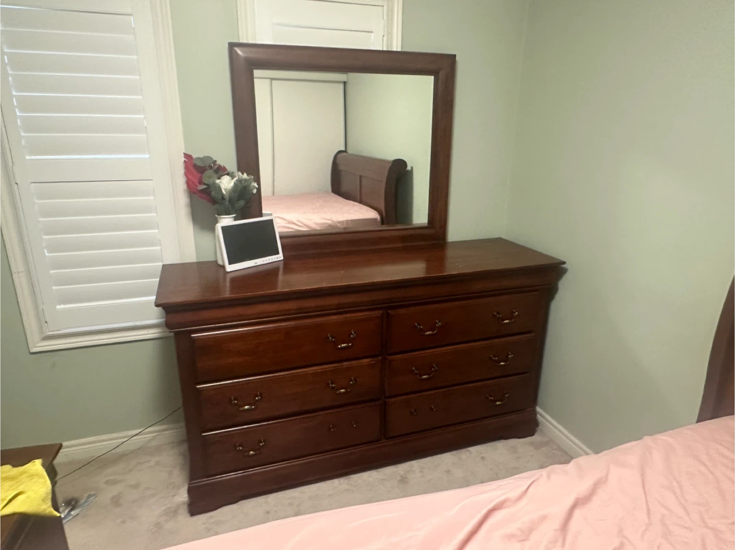Selling a wood dresser with a mirror. It's a nice, solid piece of furniture. It has six drawers for plenty of storage. The dresser has a dark wood stain giving it a vintage look making it a beautiful yet useful add to any room.