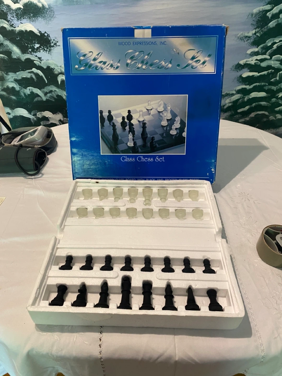 Selling a Wood Expressions Glass Chess Set! The set includes a glass board with black and frosted pieces, and comes in its original box Expressions Glass Chess Set in original box with all pieces, perfect for any chess enthusiast, brand new never used, $20obo pick up in Prices Corners cash only