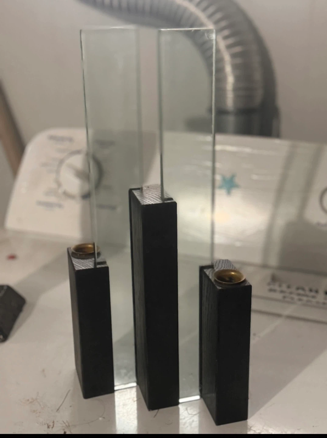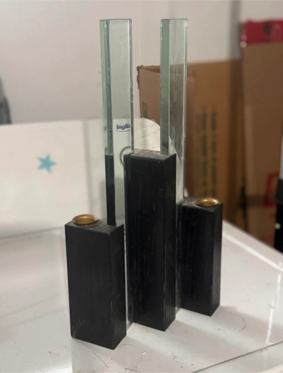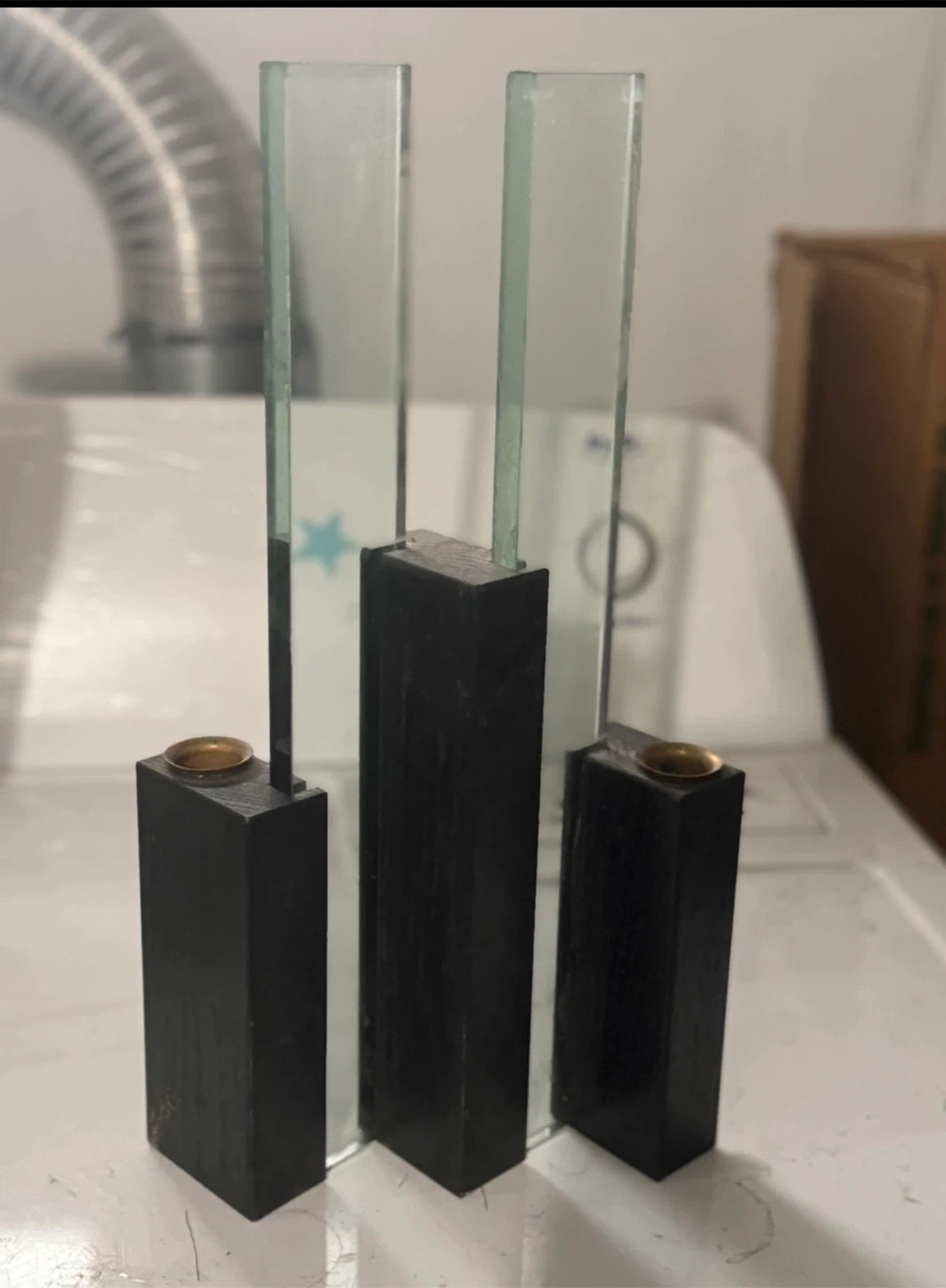 Selling a set of three candle holders. They feature a black wooden base and a clear glass panel. Perfect for adding a modern touch to your home decor!