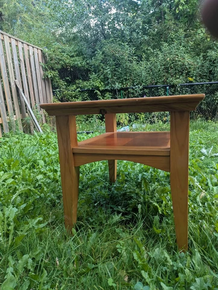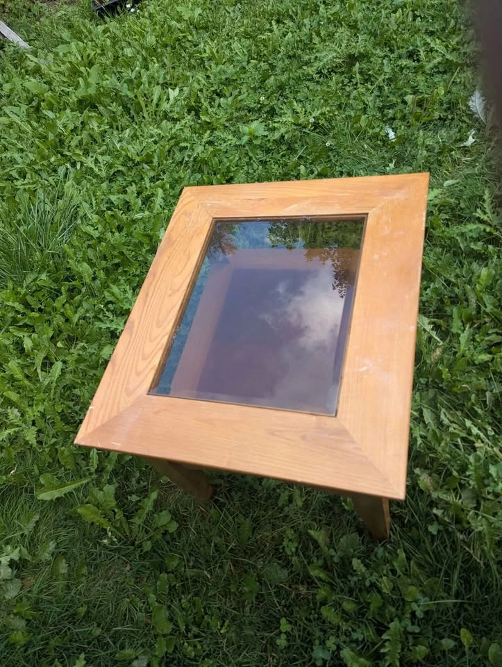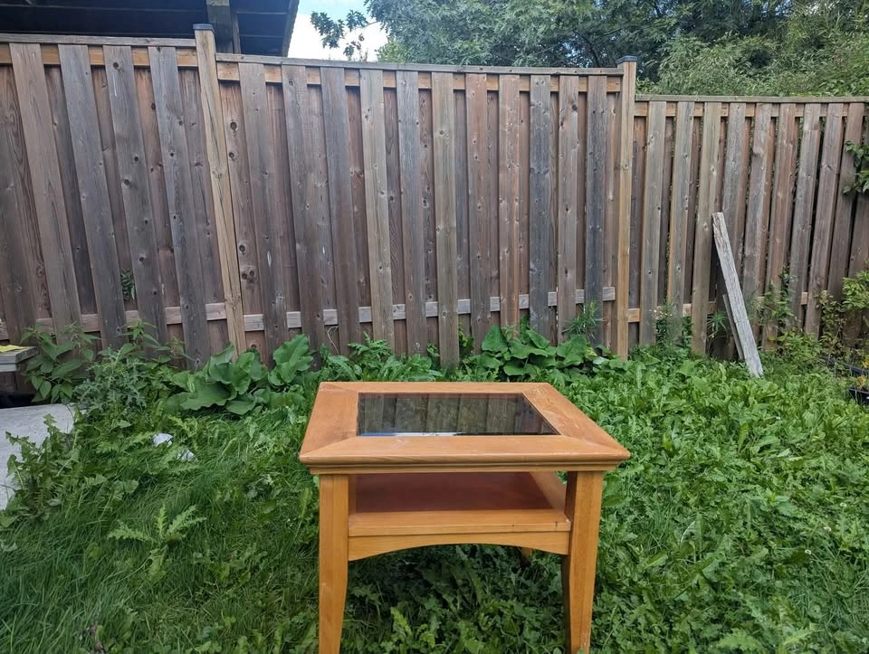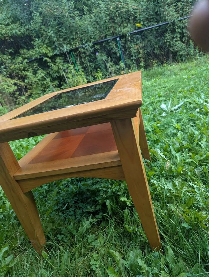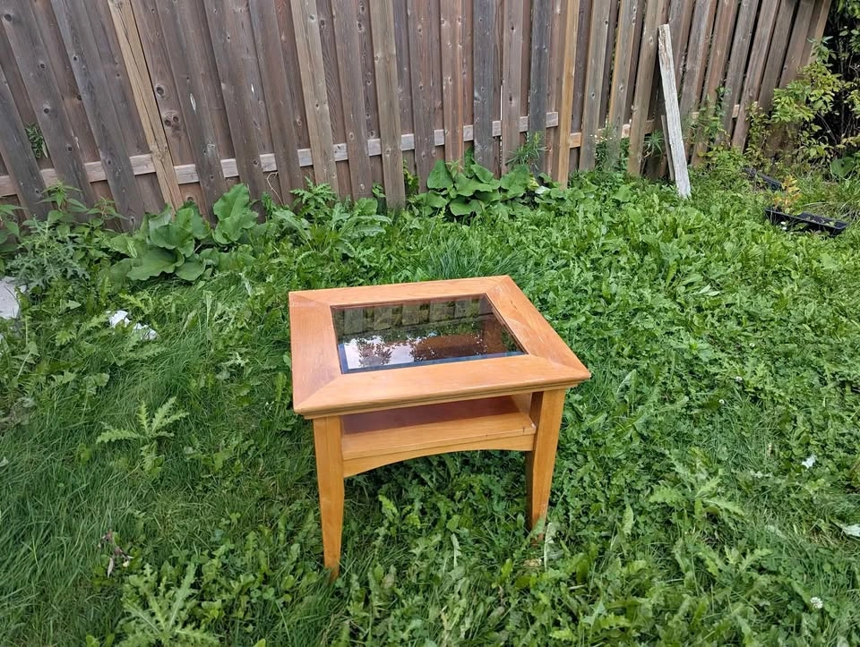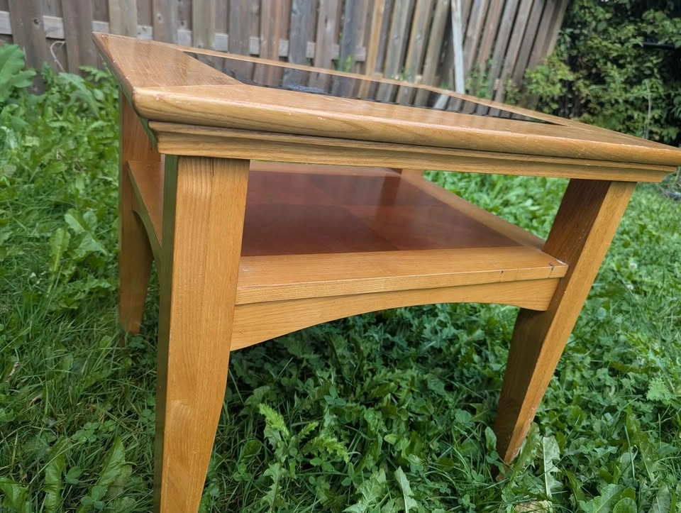 Selling a solid wood side/coffee table with a glass insert top. Sturdy construction Classic design with lower shelf for extra storage or décor Natural wood finish with a touch of elegance Great for living room, bedroom, or office use Condition: Good overall, some minor wear consistent with normal use (as shown in photos). Pickup only.
