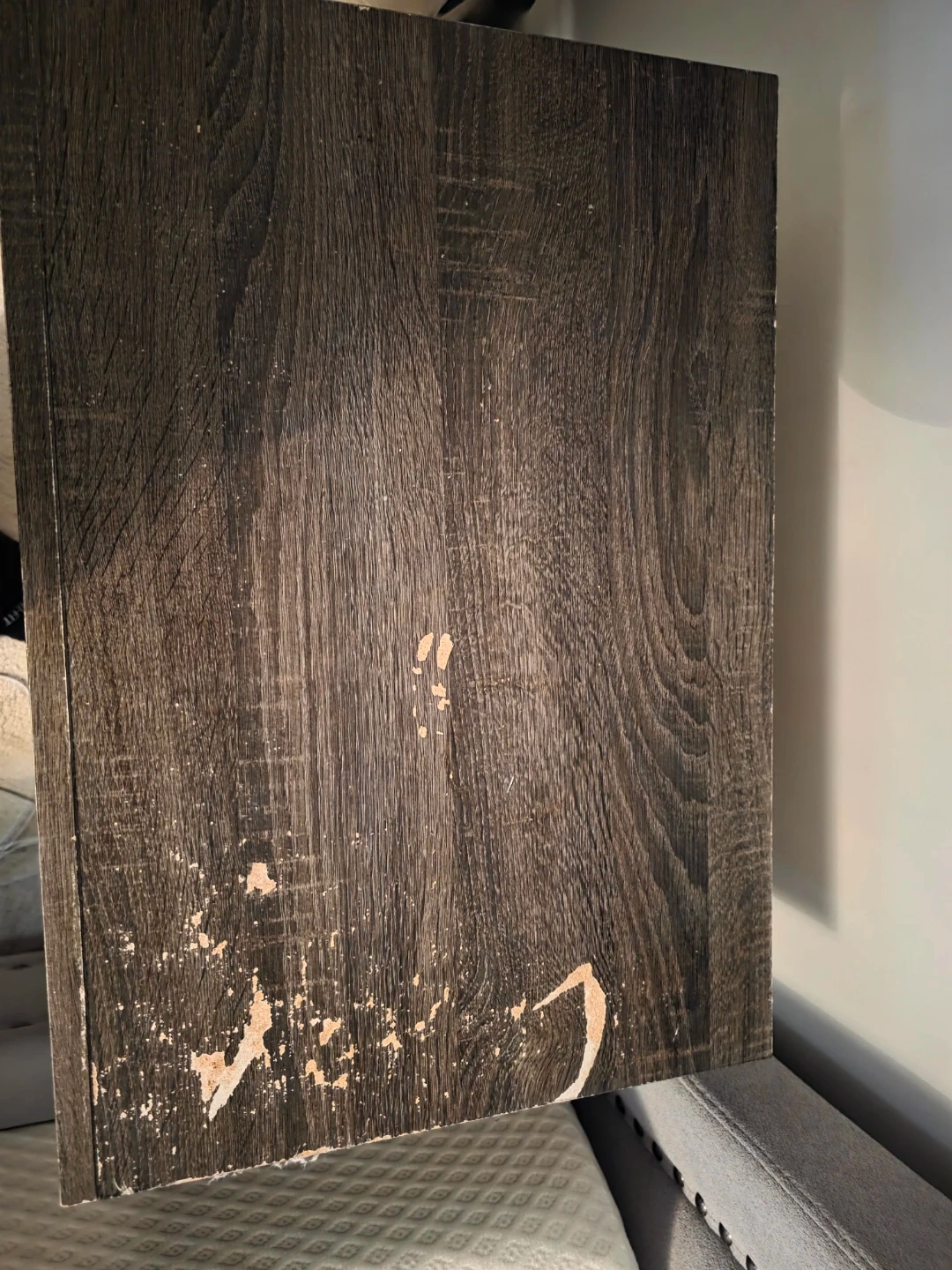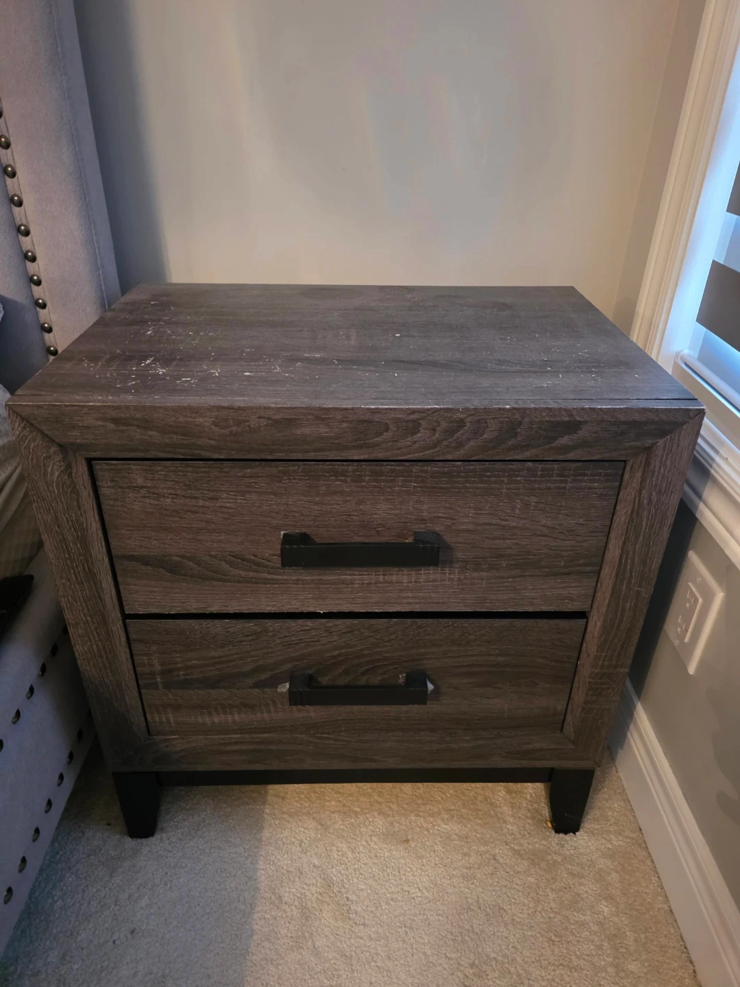 5Selling a wood nightstand with two drawers. It's a gray colour and shows some signs of wear, like scratches and scuffs, as seen in the photos. Still a functional piece for your bedroom!
