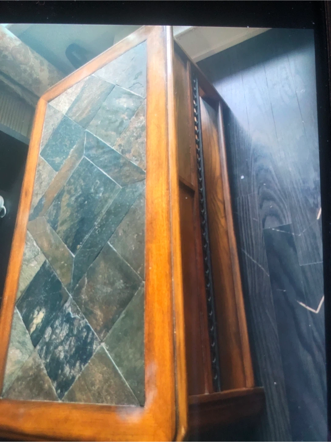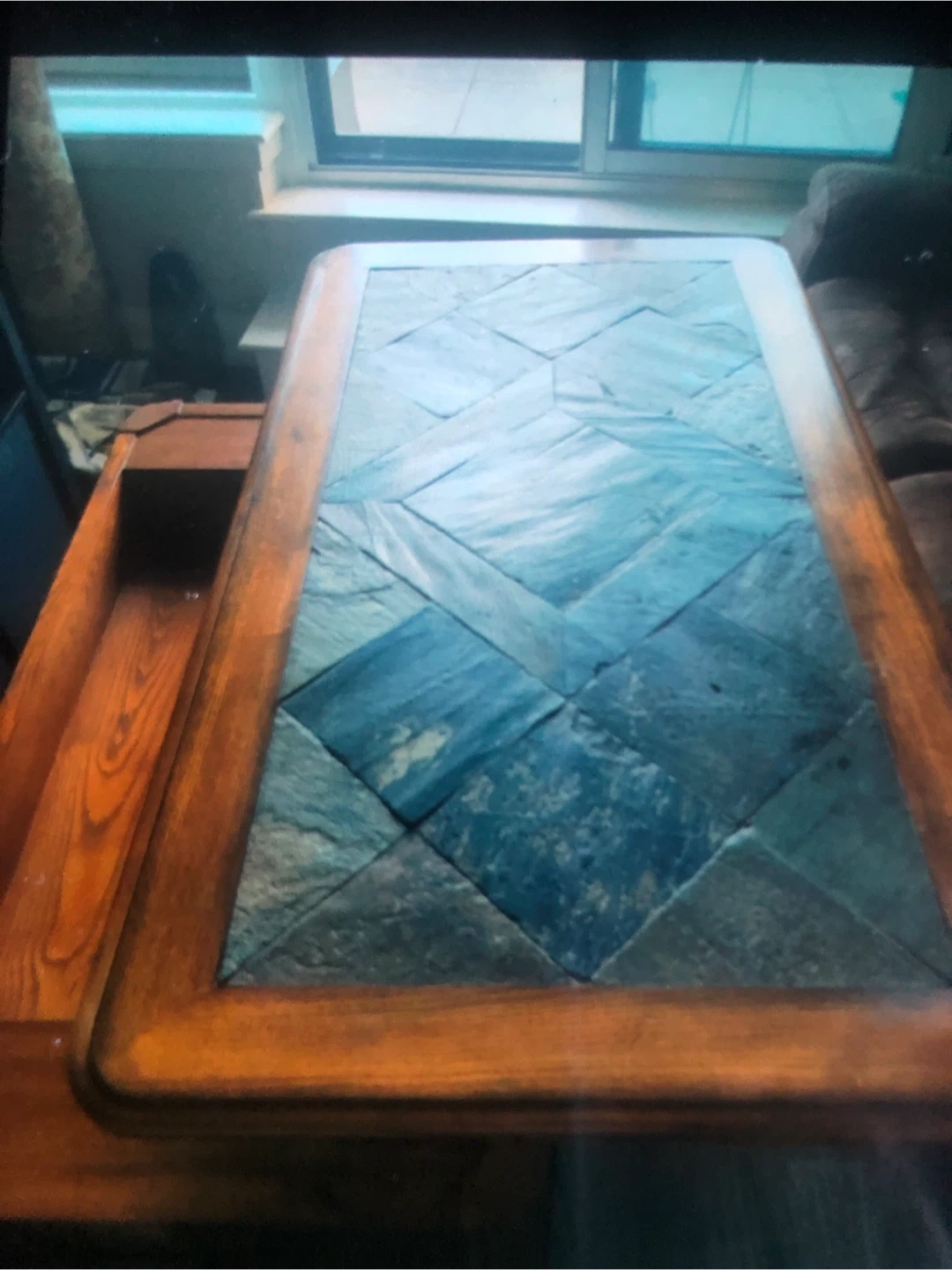 Here's a lift-top coffee table with a wood frame and a unique tile top! It's got a handy lift-top feature and a storage compartment underneath. The tile top adds a touch of style to any living space