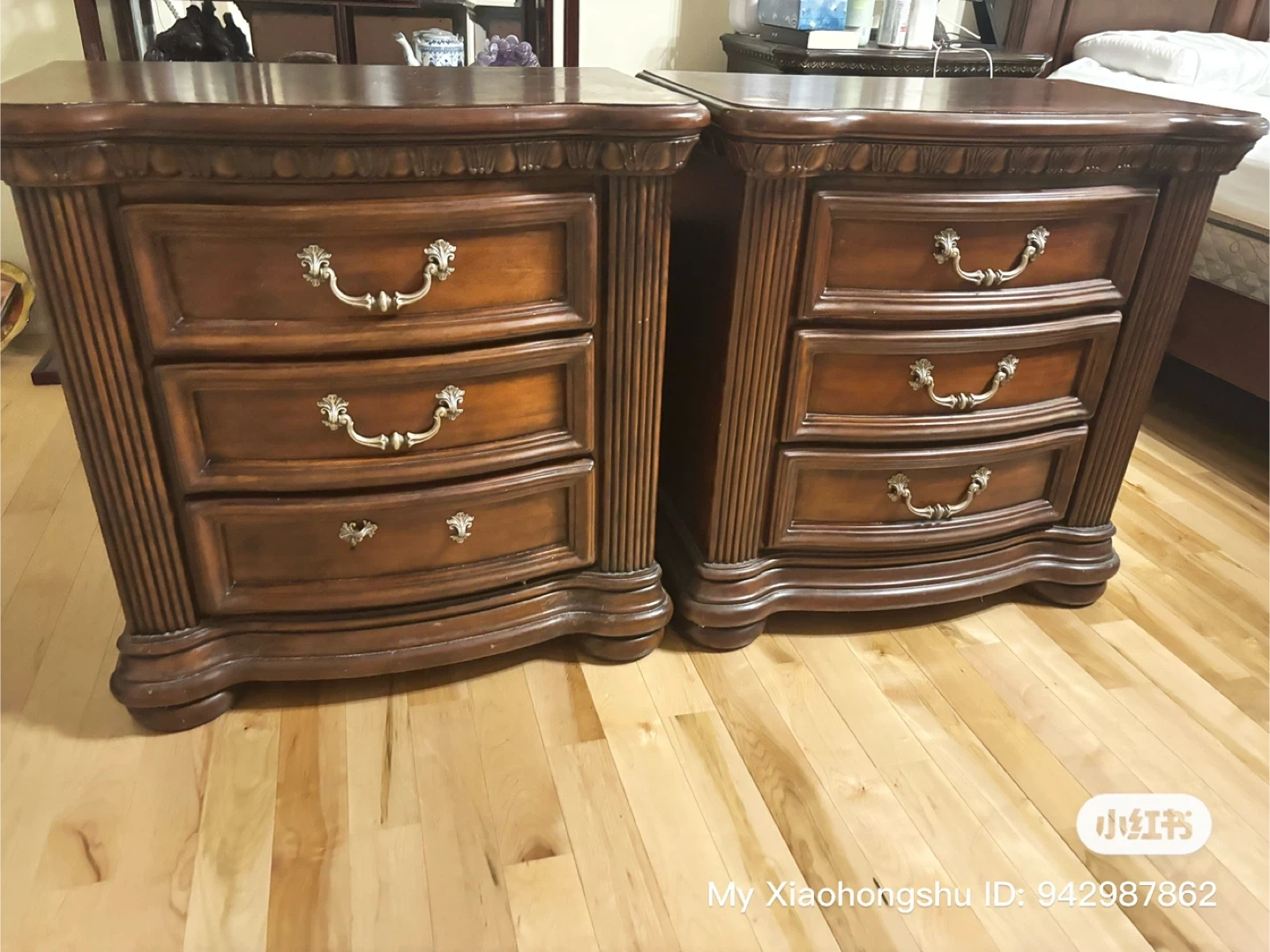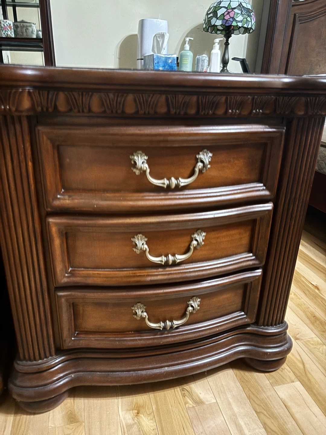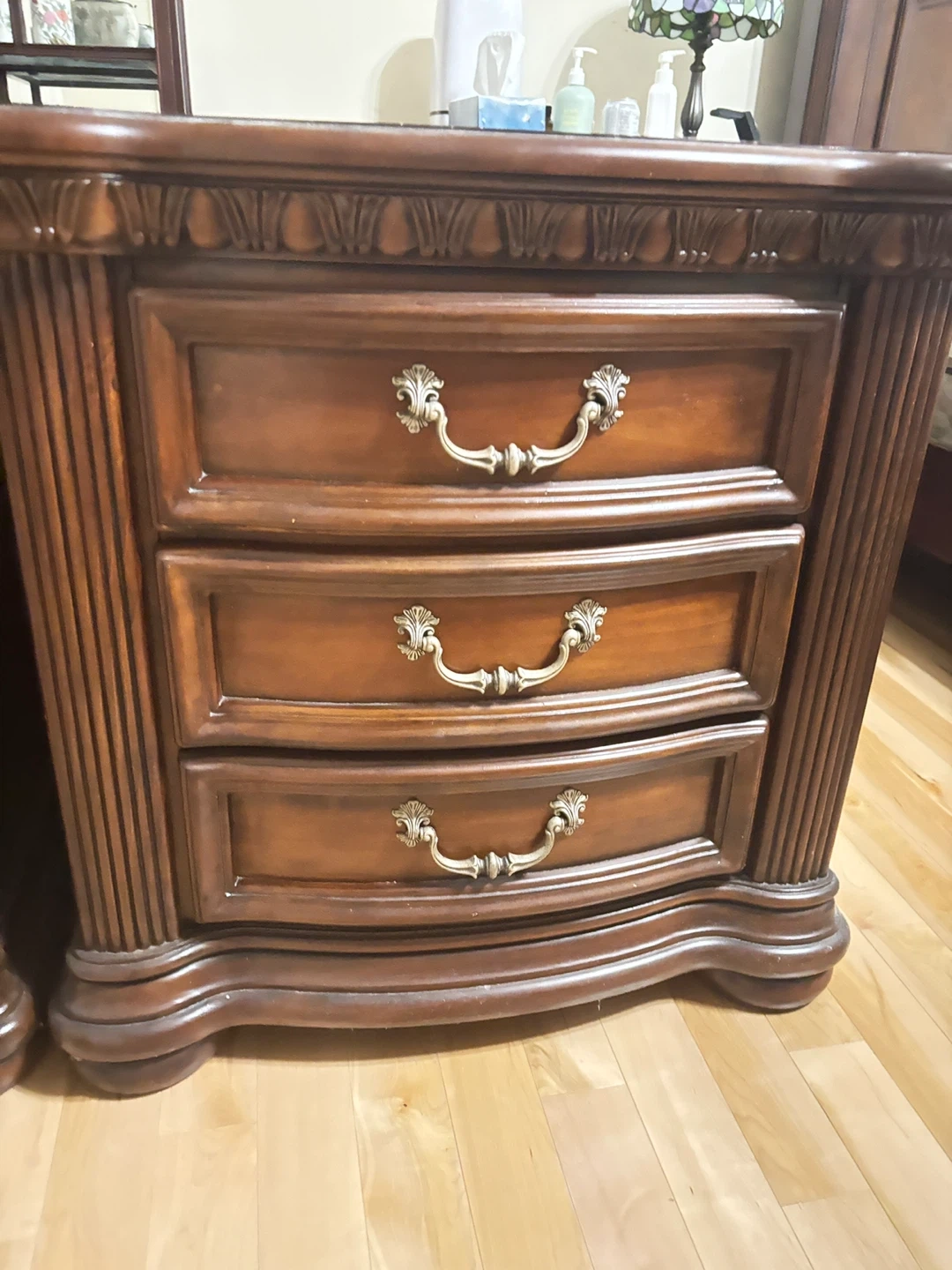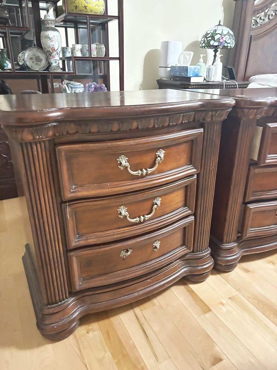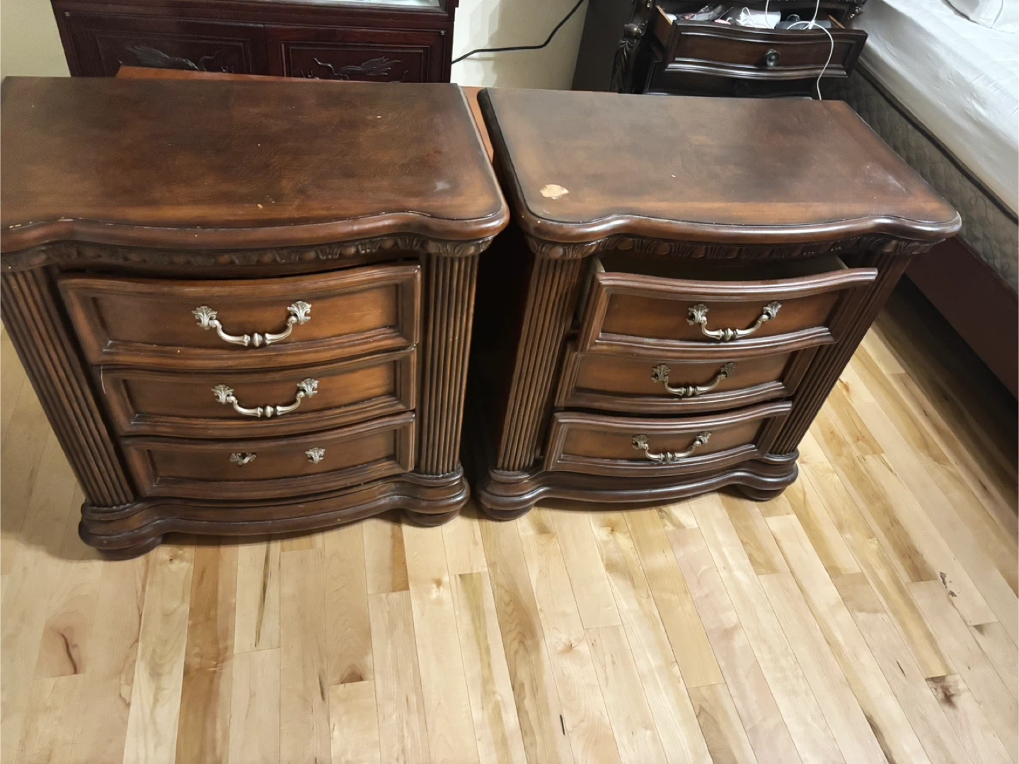Selling a pair of wooden nightstands. They feature three drawers each and have a classic, ornate design. They're in good condition and would look great in any bedroom! Great condition