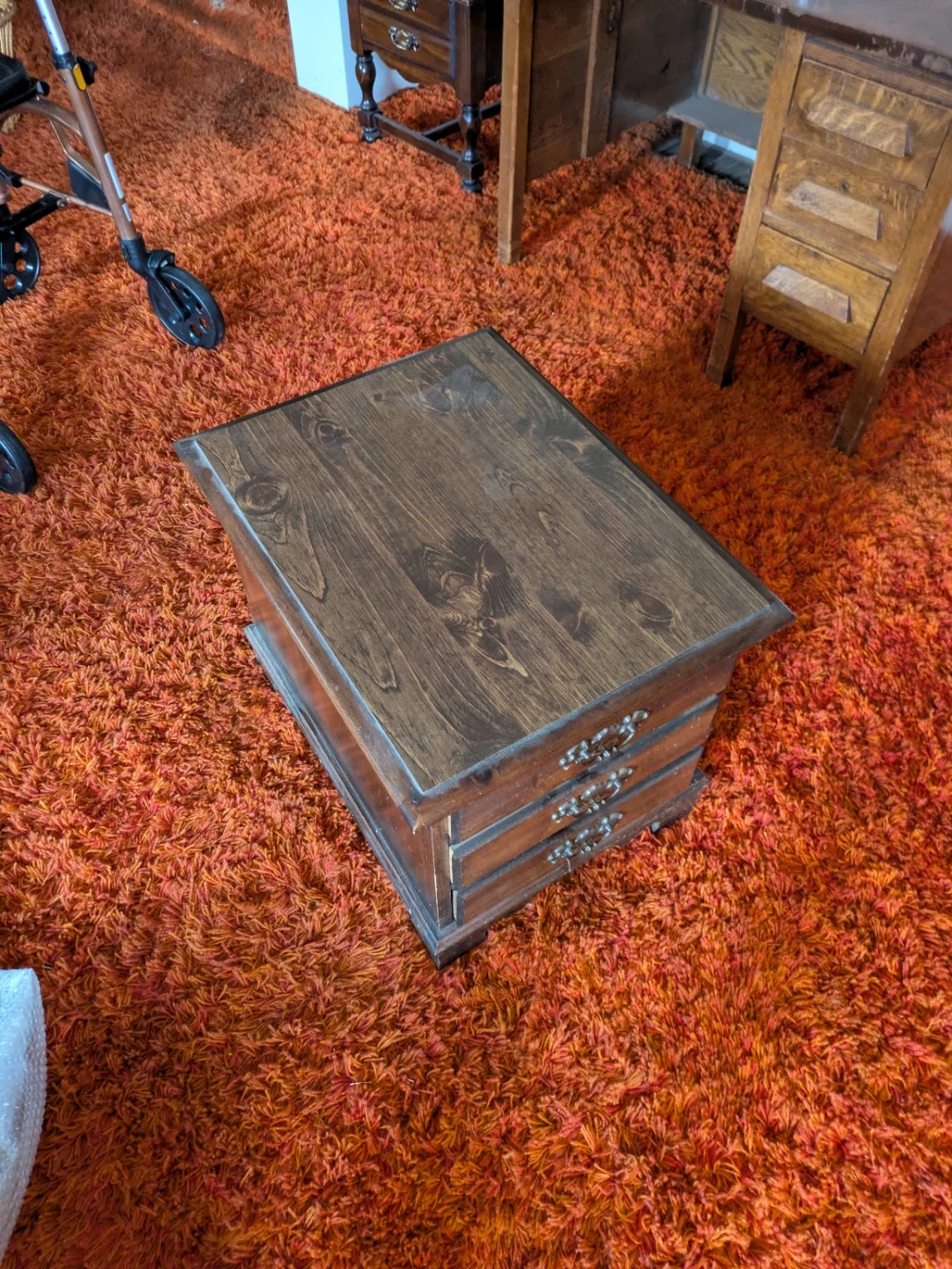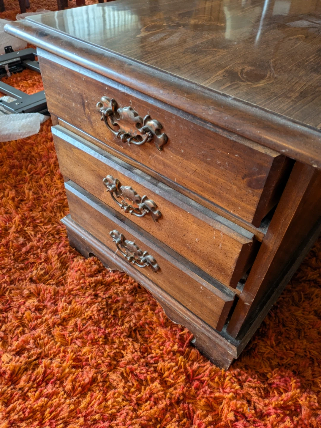 10Selling a wooden side table with three drawers. It's a great piece for any room, offering both storage and a classic look. The drawers have ornate handles, adding a touch of elegance to the design