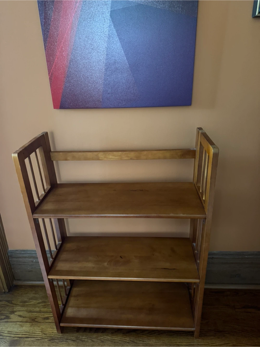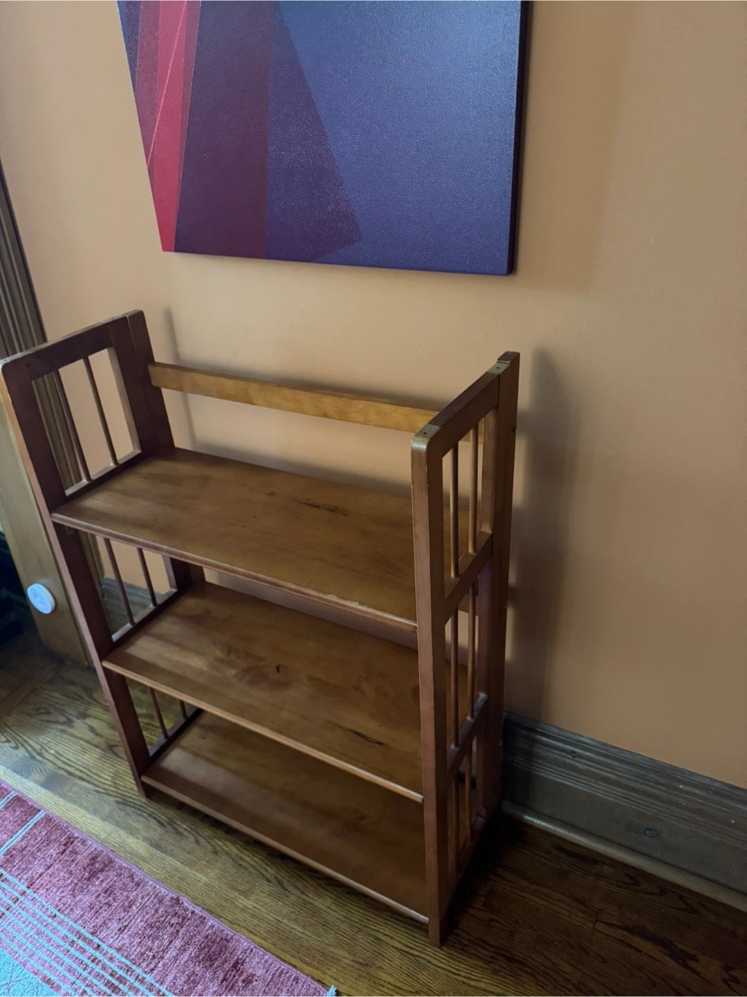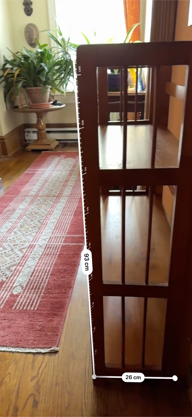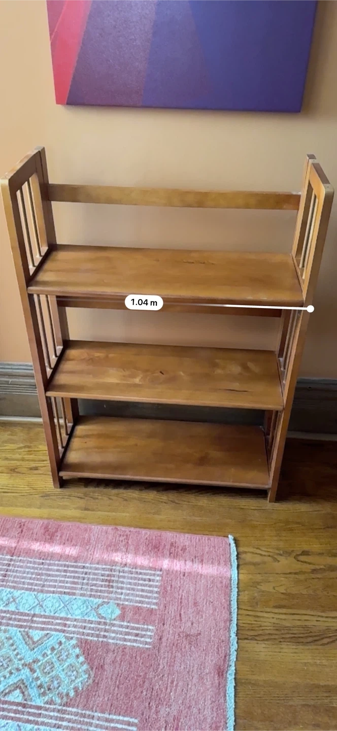103Here's a foldable sturdy wooden bookcase with three shelves! It measures approximately 93 cm tall and 1.04 m wide, with a depth of about 26 cm. It's perfect for storing books or displaying your favourite items. Before reaching out, please review my bio. Thank you.