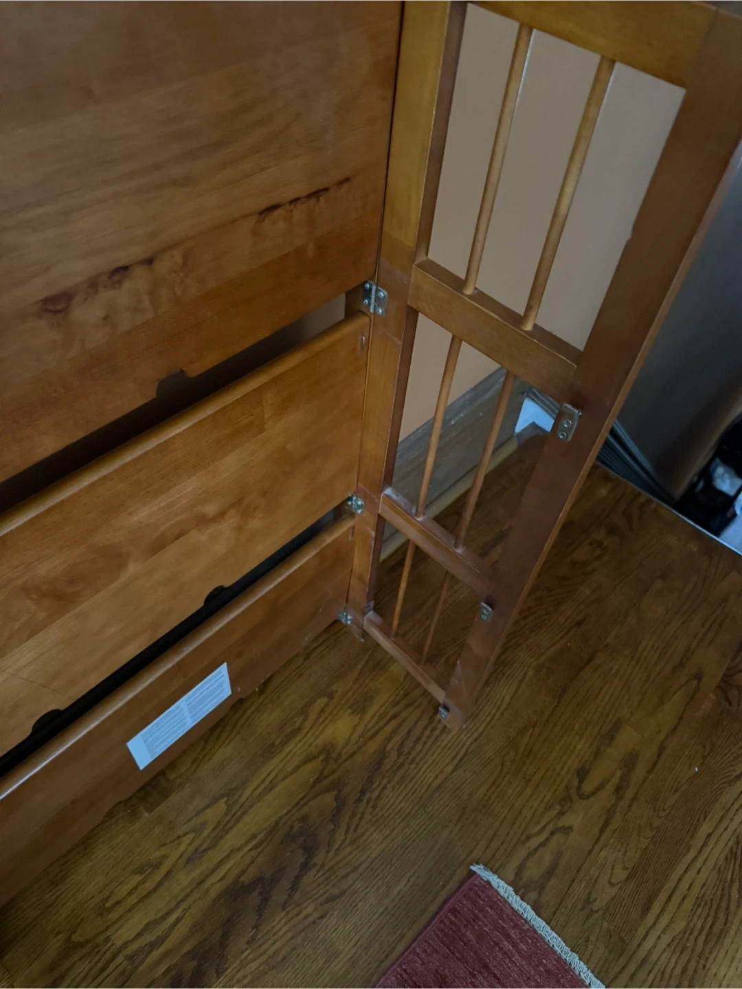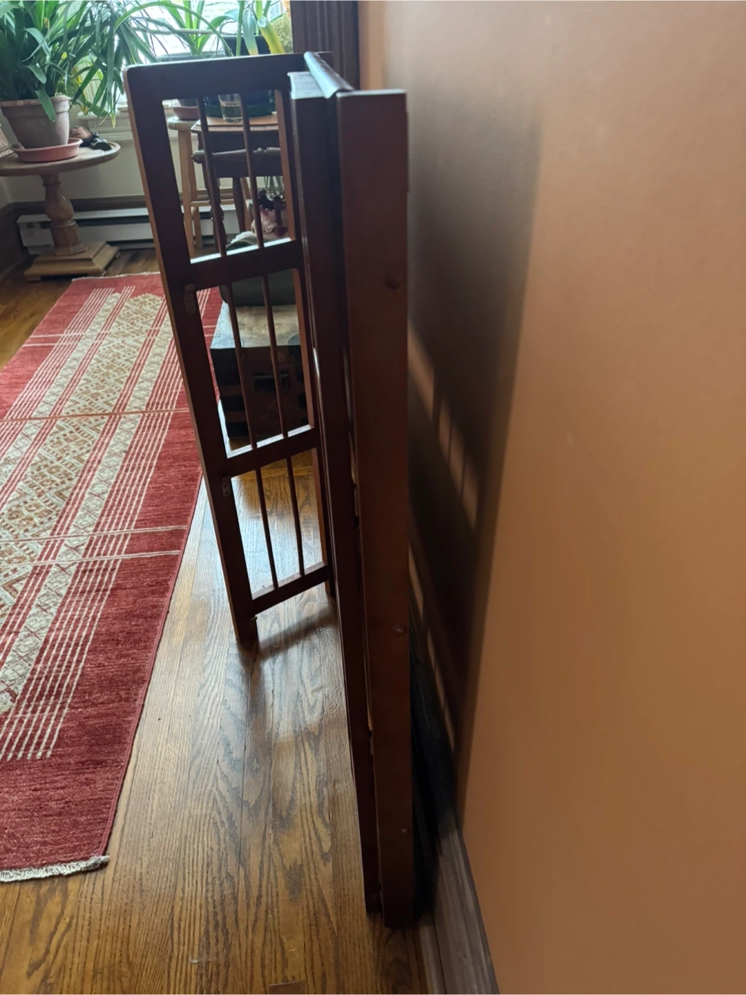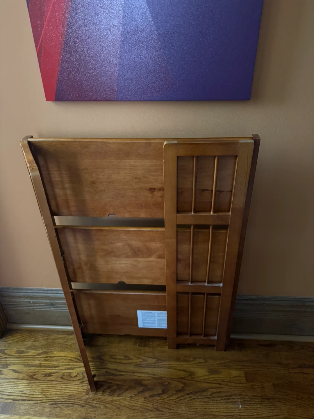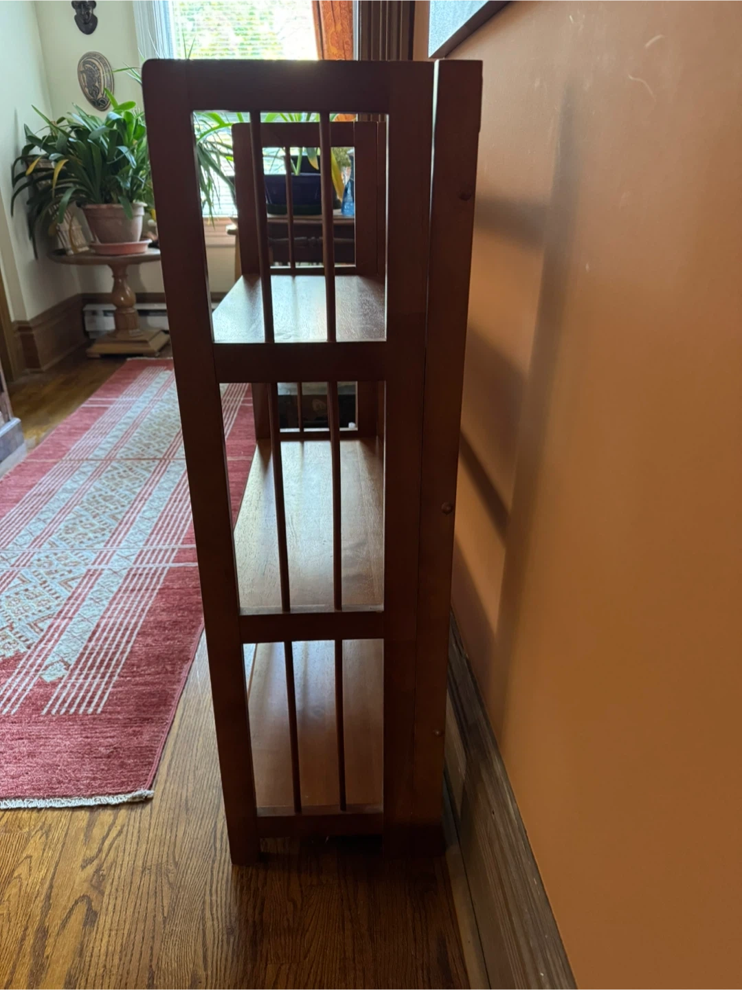 103Here's a foldable sturdy wooden bookcase with three shelves! It measures approximately 93 cm tall and 1.04 m wide, with a depth of about 26 cm. It's perfect for storing books or displaying your favourite items. Before reaching out, please review my bio. Thank you.