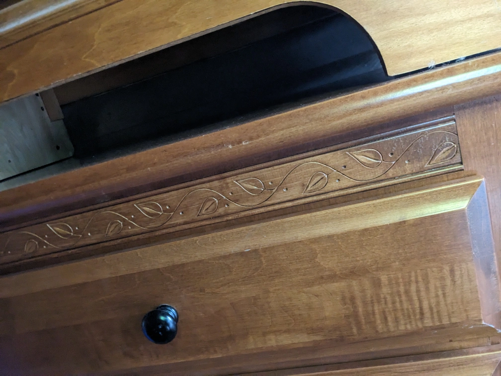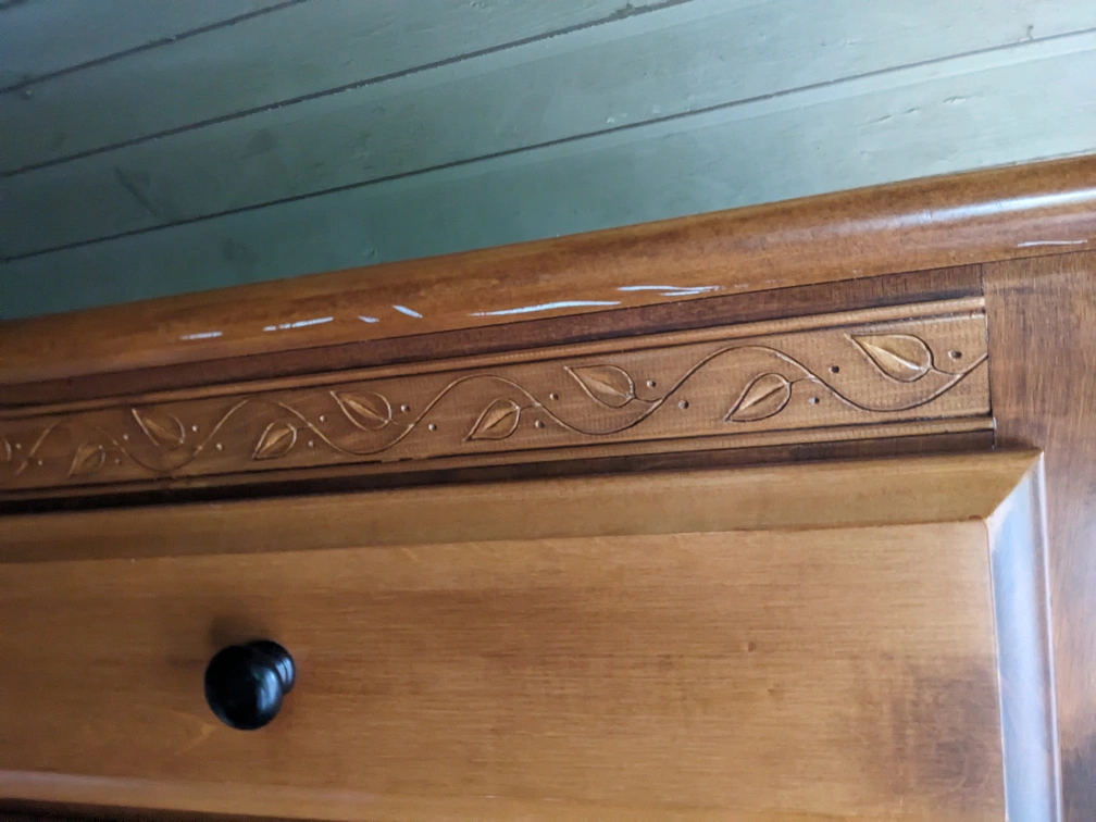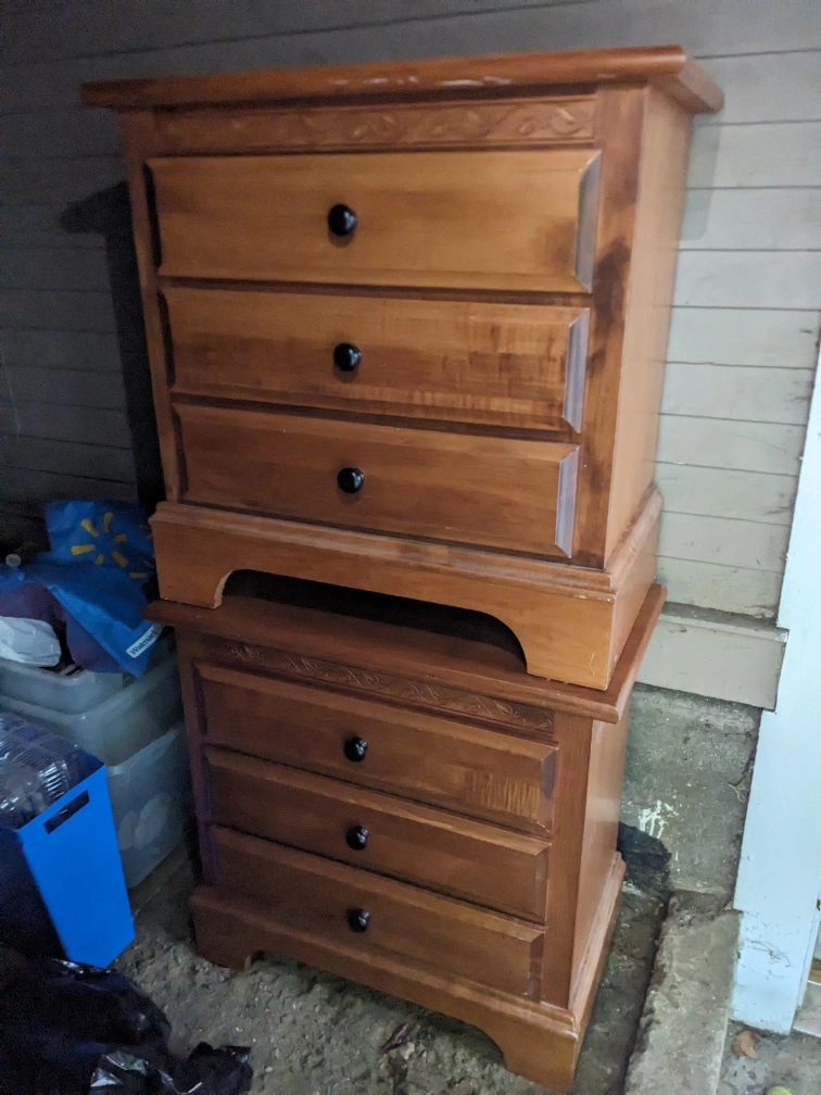 60Selling a wooden dresser set! It's a set of two 4-drawer dressers that stack on top of each other. There is a leaf design carved into the wood. Perfect for adding some extra storage to your space