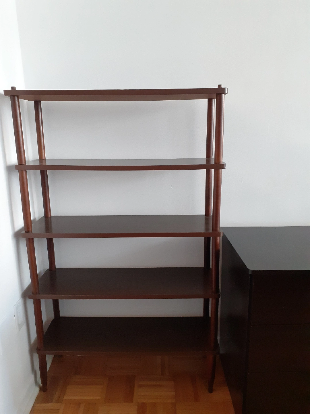 115Selling a wooden bookcase with four shelves. It's in good condition and perfect for storing books or displaying items. The bookcase has a dark brown finish. Dimensions: W: 31.5 inches ( 80 cm) D: 10.5 inches ( 26.5 cm) H: 51 inches ( 130 cm)