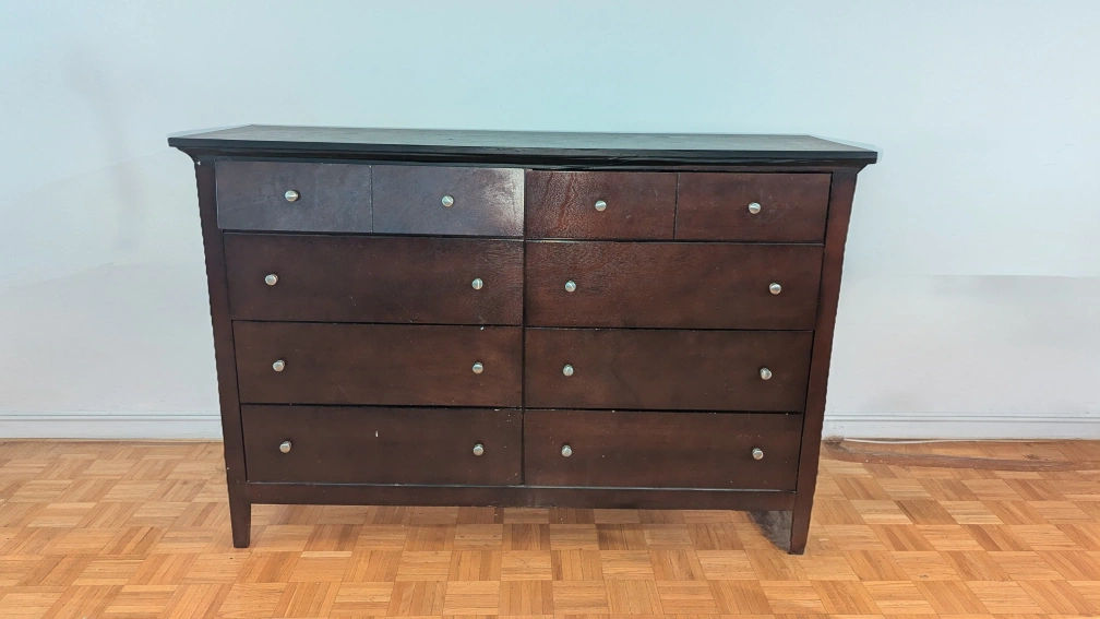 25The Wooden 8 Drawer Dresser offers ample storage with its eight drawers and features a rich finish that adds traditional charm to any bedroom. Its sturdy English dovetail joinery and durable Kenlin metal drawer glides ensure long-lasting use. Features: - Kenlin metal drawer glides - Dust-proof case bottom