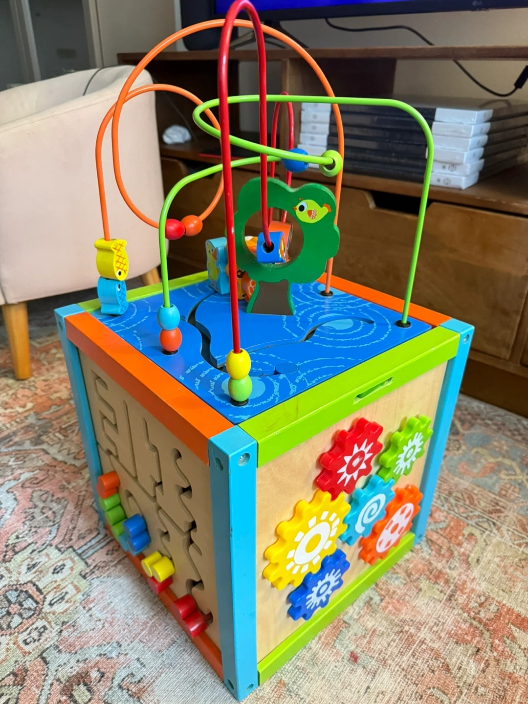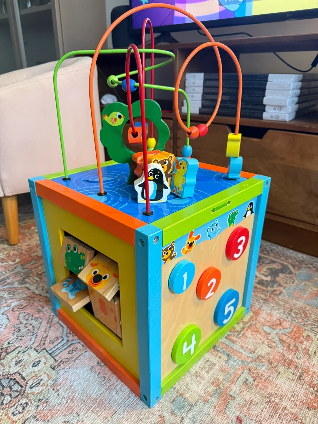 This wooden activity cube is perfect for toddlers! It has a variety of activities to keep little ones entertained, including a bead maze, shape sorter, gears, and number buttons. It's in great condition and ready for a new home!