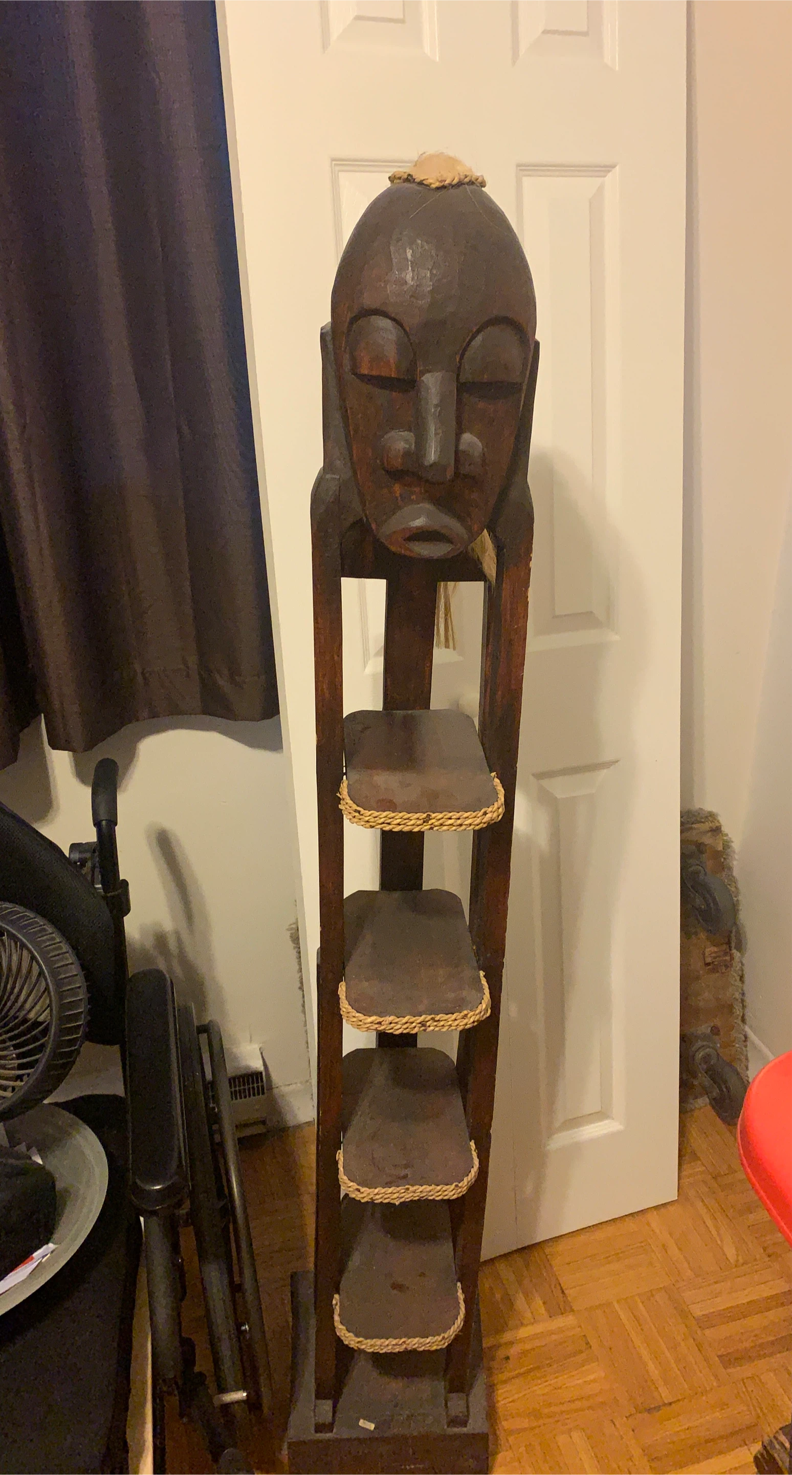 Unique wooden shelf with an African-inspired design! This piece adds a touch of cultural flair to any room. It features multiple shelves, perfect for displaying plants, books, or decorative items. It's a sturdy and eye-catching piece of furniture