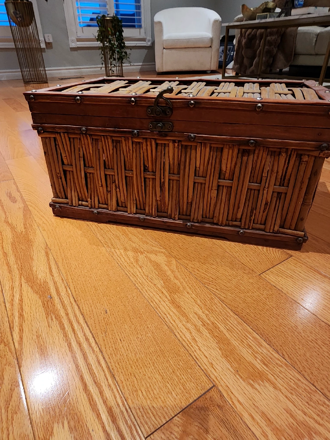 Selling a charming wooden and wicker storage trunk. It's in great shape and perfect for adding a touch of rustic style to your home. The trunk features a hinged lid and rope handles on the sides. It's ideal for storing toys, or other household items!