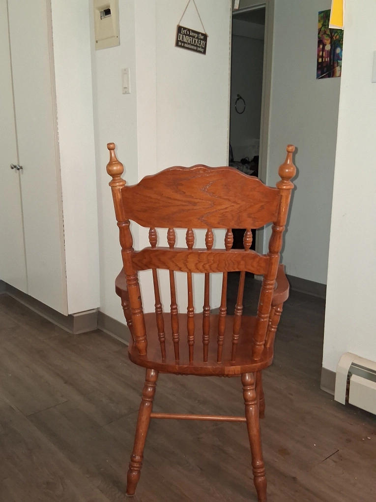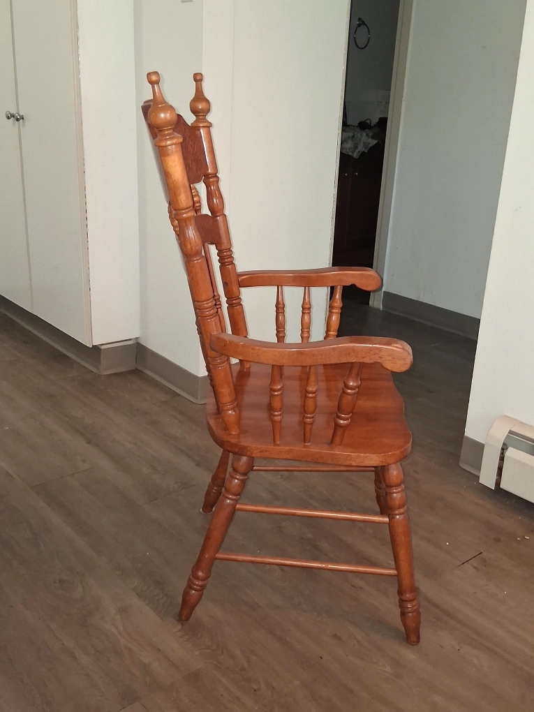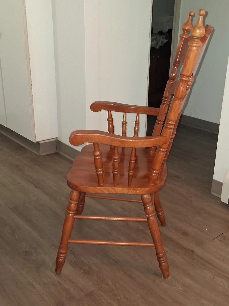 A lovely wooden armchair that would look great in any room! It's sturdy and comfortable, perfect for relaxing with a book or enjoying a cup of tea. The wood has a beautiful warm tone that adds a touch of classic charm to your space. It's really too bad to sell this beautiful chair but... Circumstances have not been good as of late.