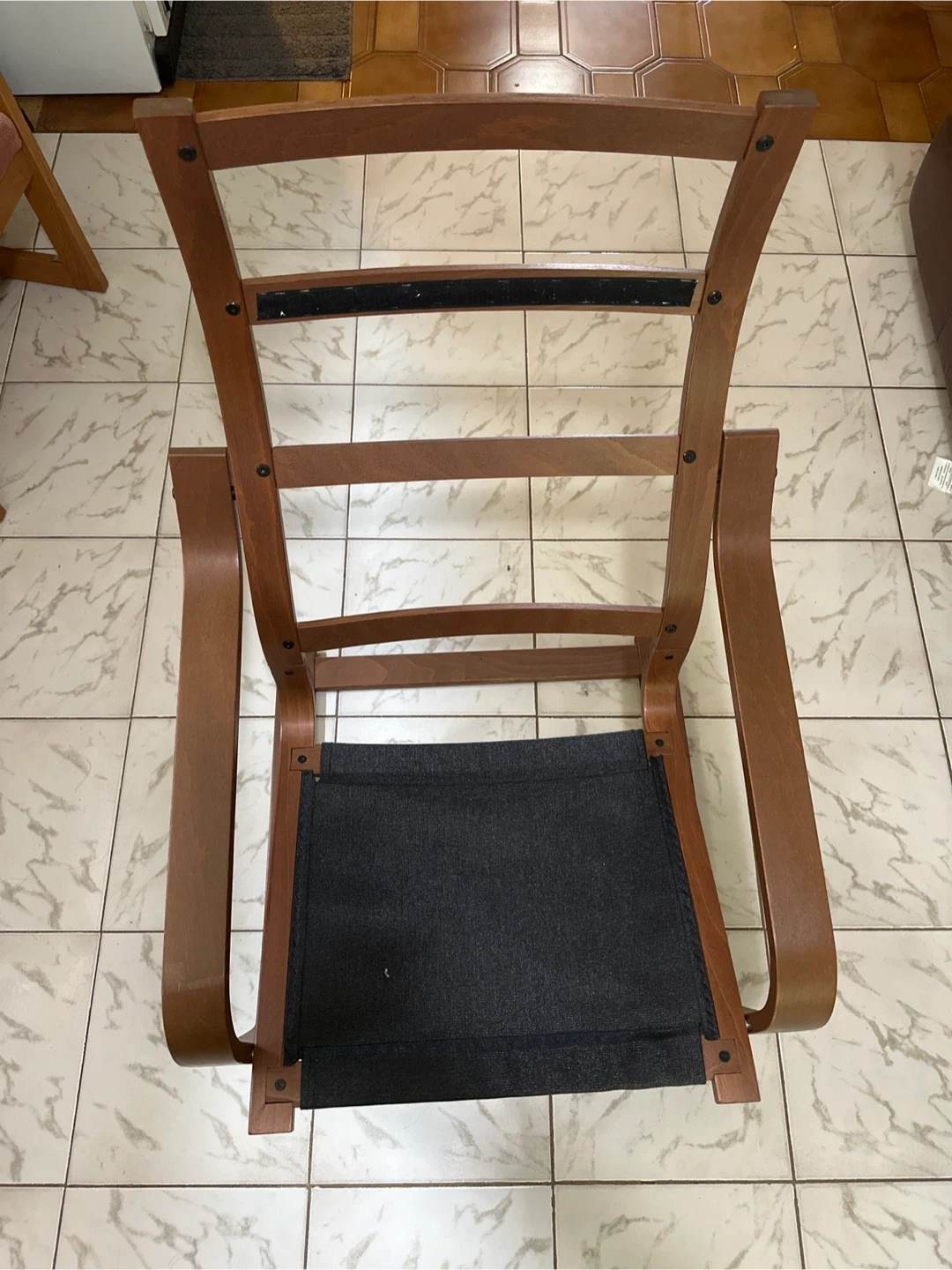 Selling a wooden armchair with a grey fabric seat. It's in good condition and would be a great addition to any living space or reading nook. The wood has a warm tone, and the fabric is a neutral grey that should fit in with most decor styles