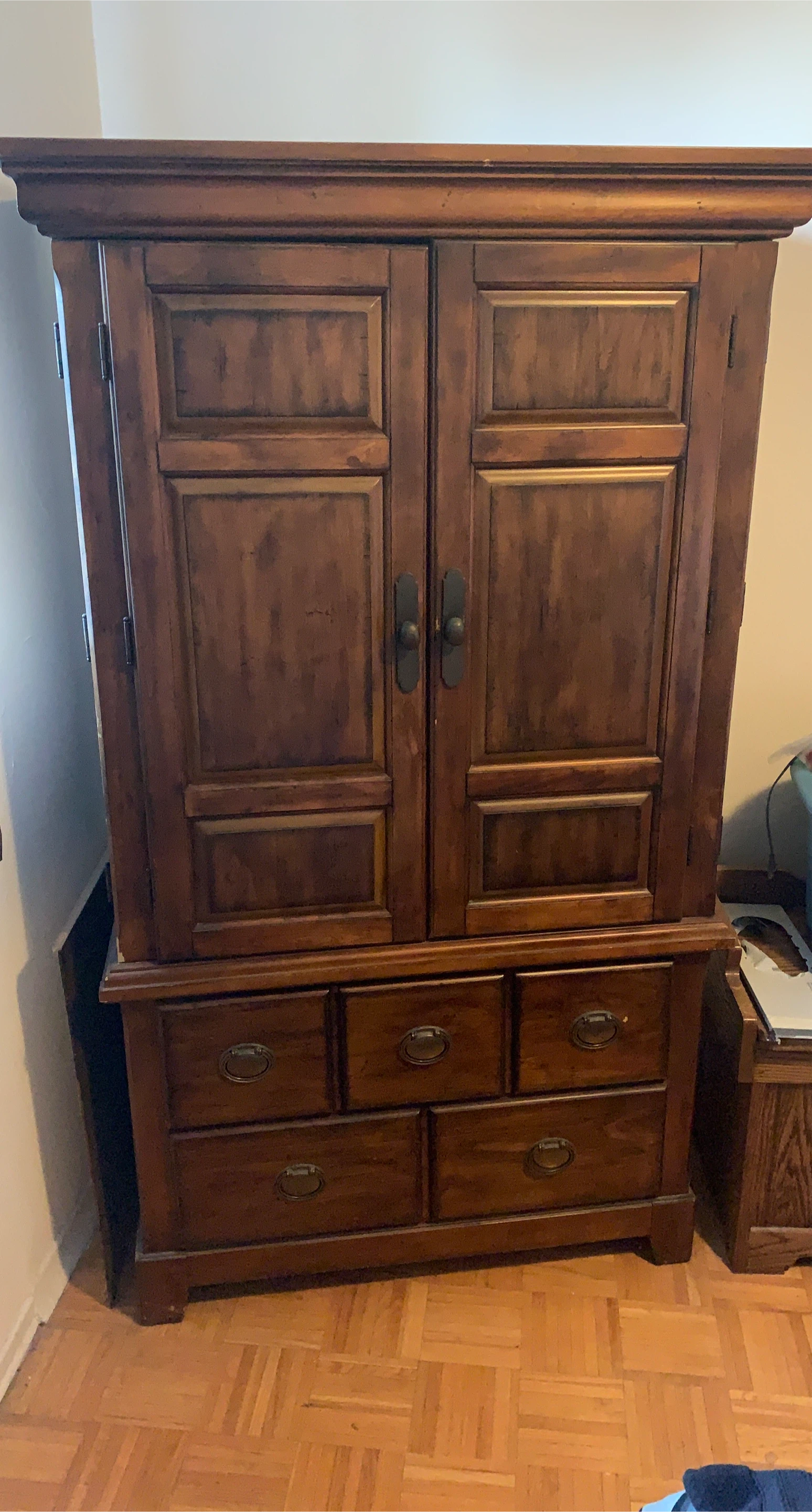 Here's a lovely wooden armoire with lots of storage space. It features both drawers and cabinet space, perfect for organizing your belongings. The wood has a beautiful, warm tone that would complement any room!