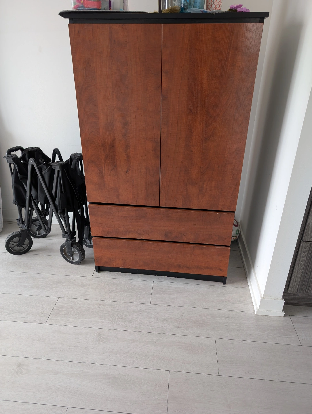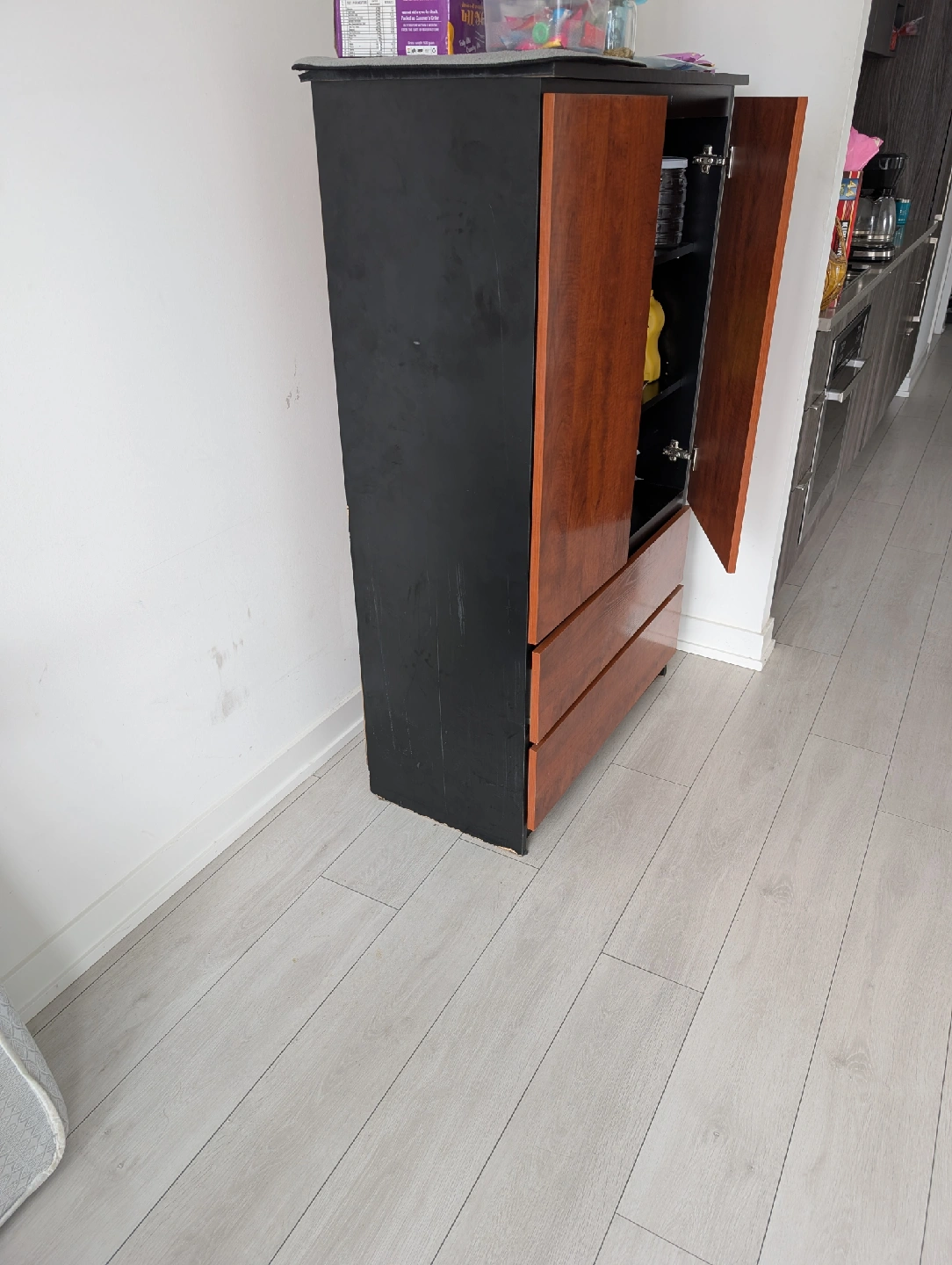 Selling a wooden armoire with drawers. It features a dark brown wood finish on the doors and drawers, with a black top and sides. There are some visible scratches on the side. Great for extra storage!