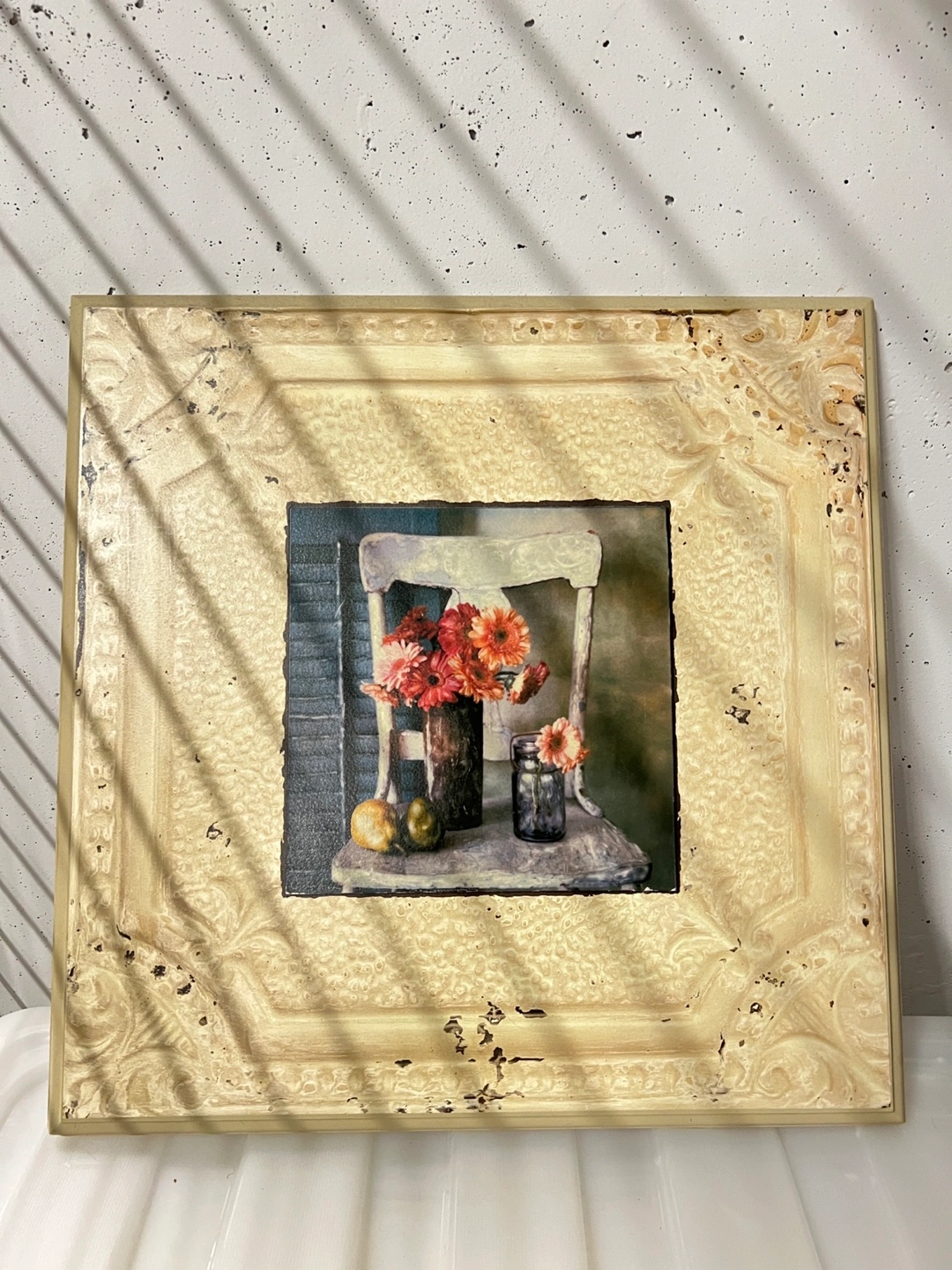 Selling a wooden art print featuring a floral arrangement. The print is in good condition and ready to hang. Would look great in any room!