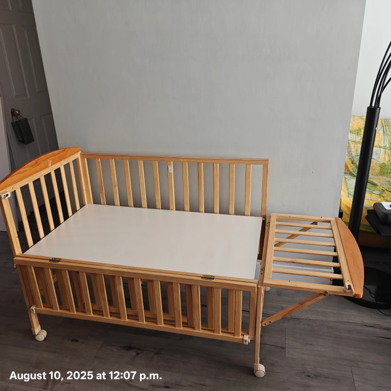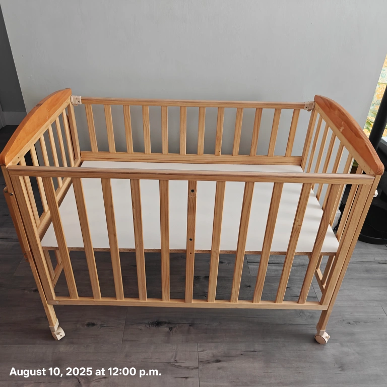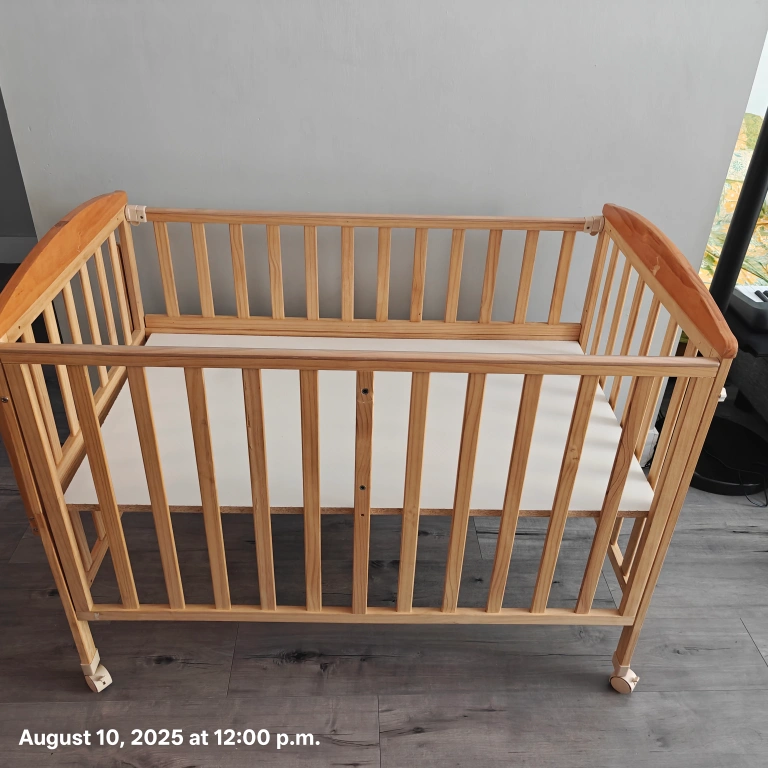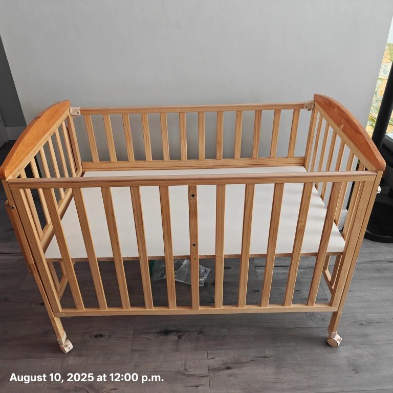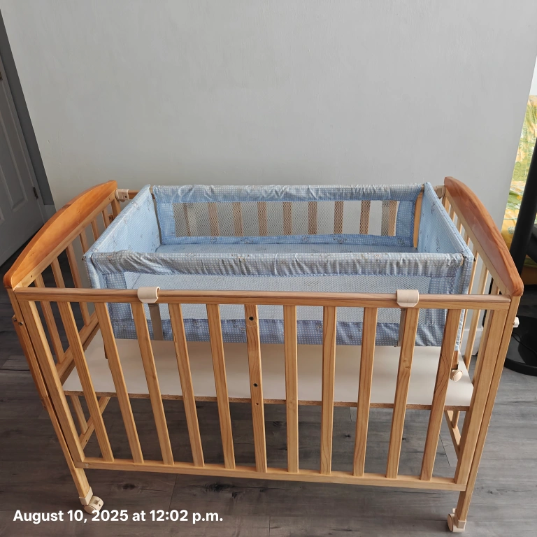 20Selling a gently used wooden baby crib. It's in great condition and ready for a new home. It also comes with a blue movable basinet. Basinet can be taken out and can be used outside the baby crib to keep little baby near sitting area. Blue movable basinet has wheels. Baby crib comes with organic cotton mattress with a fitted sheet. This baby crib doesn't have bottom base but I have extra wood piece that I used. I am ready to give out that or you can use your own wood for the bottom base.