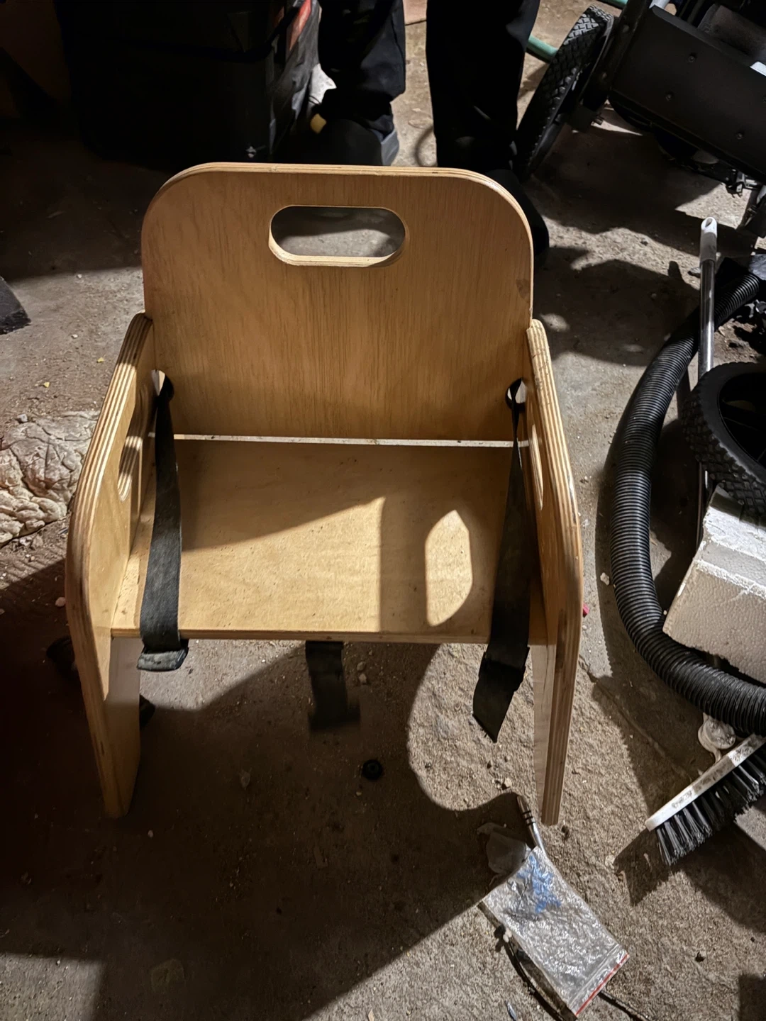 I'm selling a wooden baby/toddler chair. It's made of wood and comes with safety straps to keep your little one secure. This chair is perfect for meal times or any activity where you need a safe and comfortable seat for your child