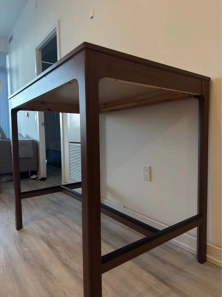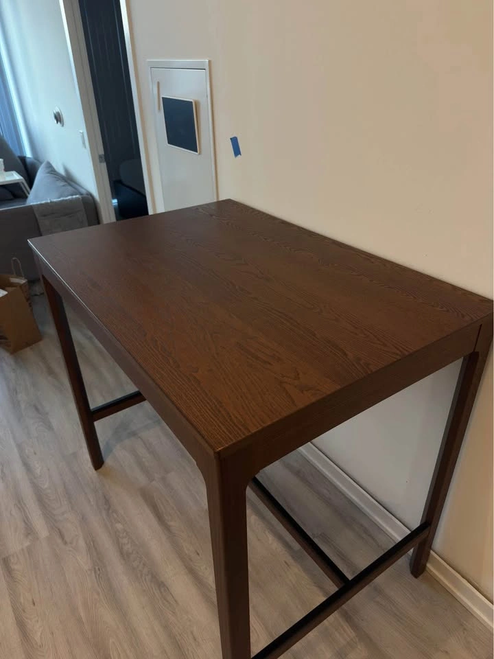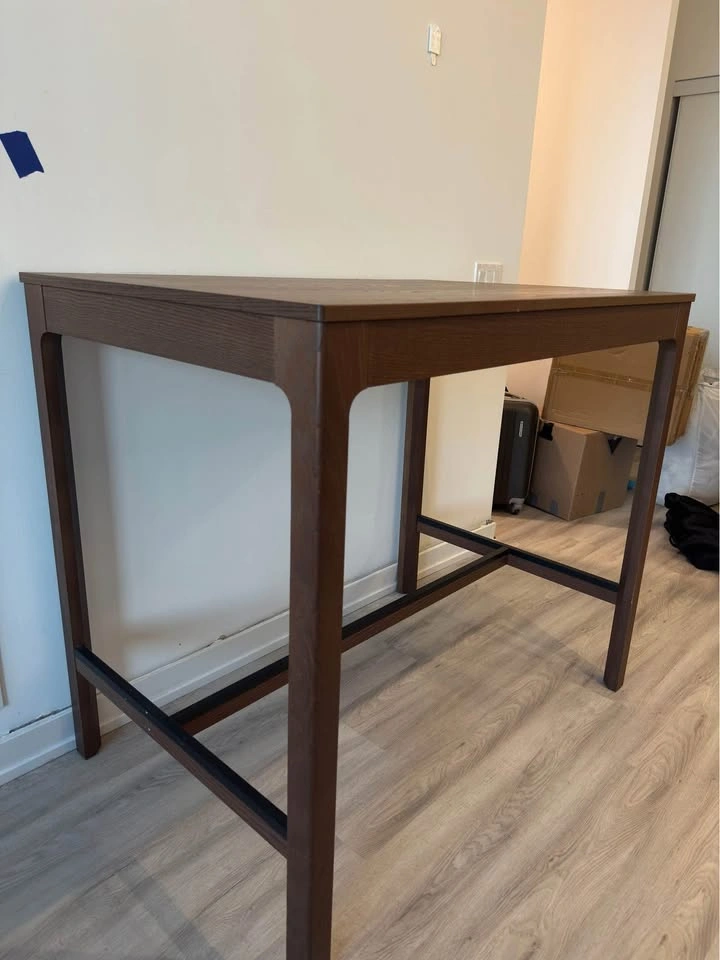 65Dark brown wooden bar table. 300$ value. Selling because got a new one. Pick up by union station (sugar wharf area). Table comes in parts, I will give you separated by bags screws, details and manual with it, so you can easily put it together :) Let me know if you're interested!