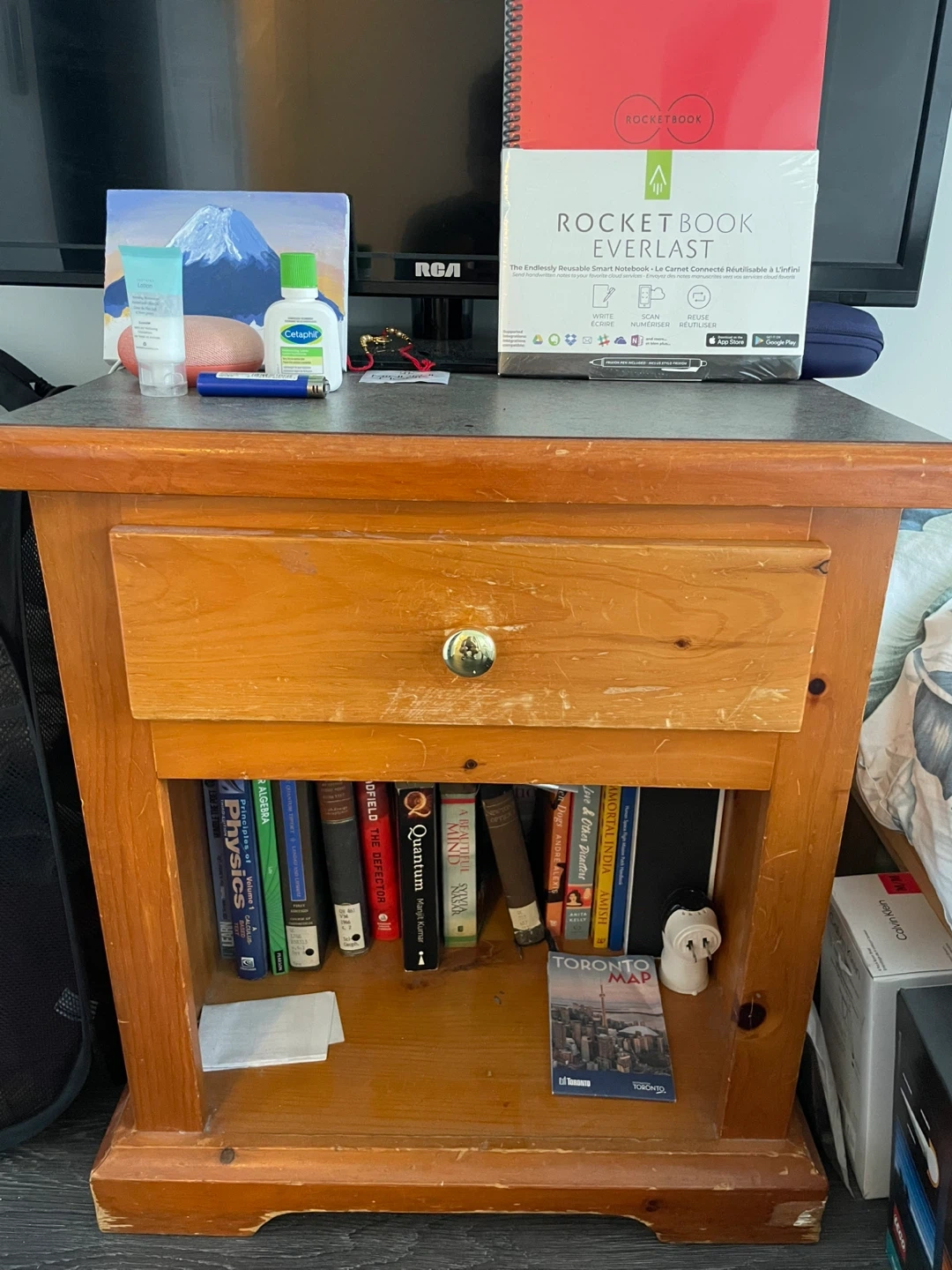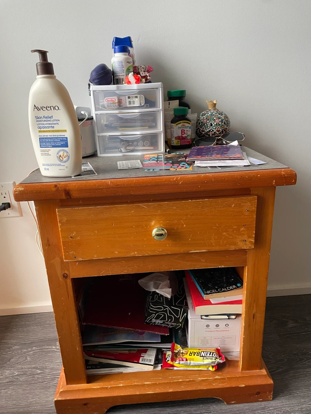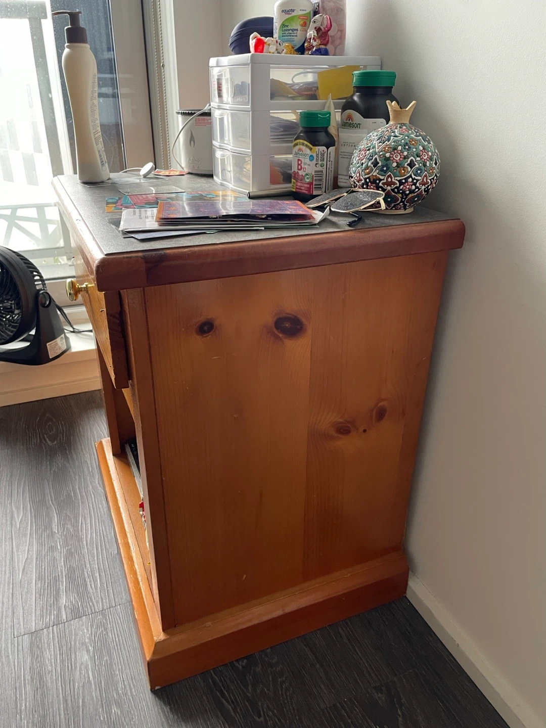 Selling 2 cute wooden bedside tables! These well-built, classic nightstands feature a timeless design that fits with almost any decor. Each has a smooth-gliding drawer and a spacious lower shelf, perfect for keeping your bedside area organized. They show some signs of wear, but they’re still sturdy and have lots of life left in them — very sturdy! We’re upgrading our bedroom furniture, so these are no longer needed. Priced to sell: $25 for one, or a deal at $40 for the set of two. Also happy to throw in a 43” TV (in the pictures) for $40 more. :) Pickup only. If the listing is up, they’re still available.