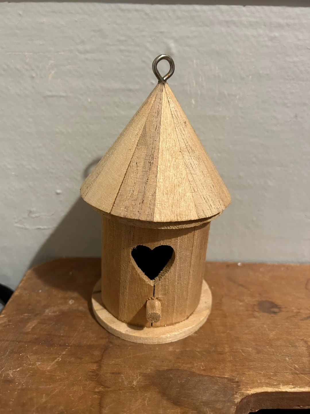 954Here's a cute wooden birdhouse! It features a heart-shaped opening and a small perch. Perfect for adding a touch of charm to your garden or home decor