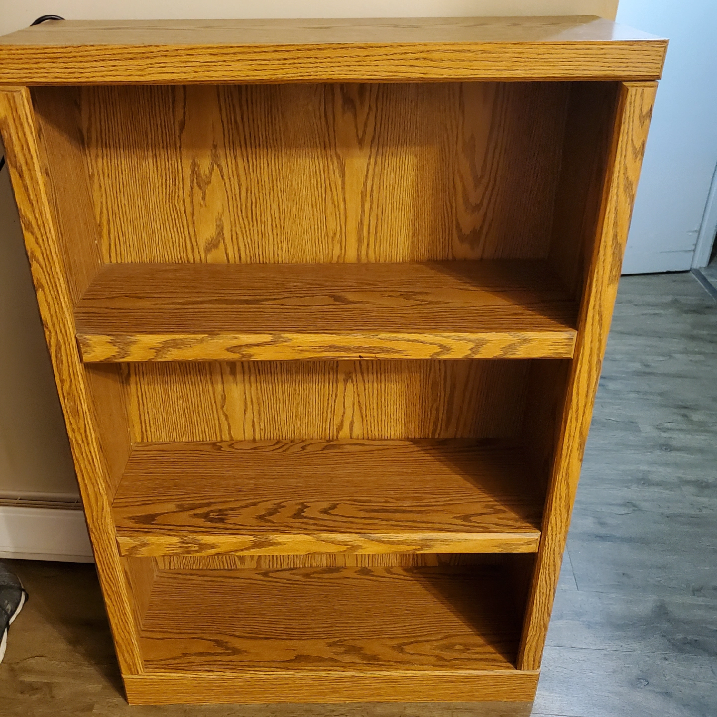 Here's a wooden bookcase that's ready for a new home! It has three shelves, perfect for books, plants, or anything you'd like to display. The wood grain gives it a nice, classic look that would fit well in any room