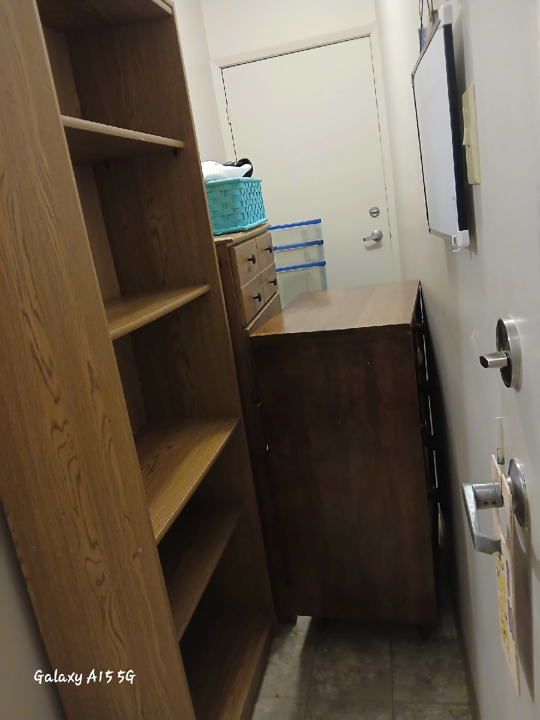 Selling a wooden bookcase. It would be great for extra storage in any room! The wood grain is quite lovely. One solid shelf and three adjustable shelves