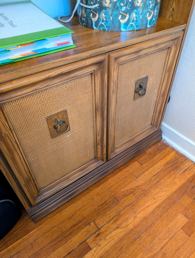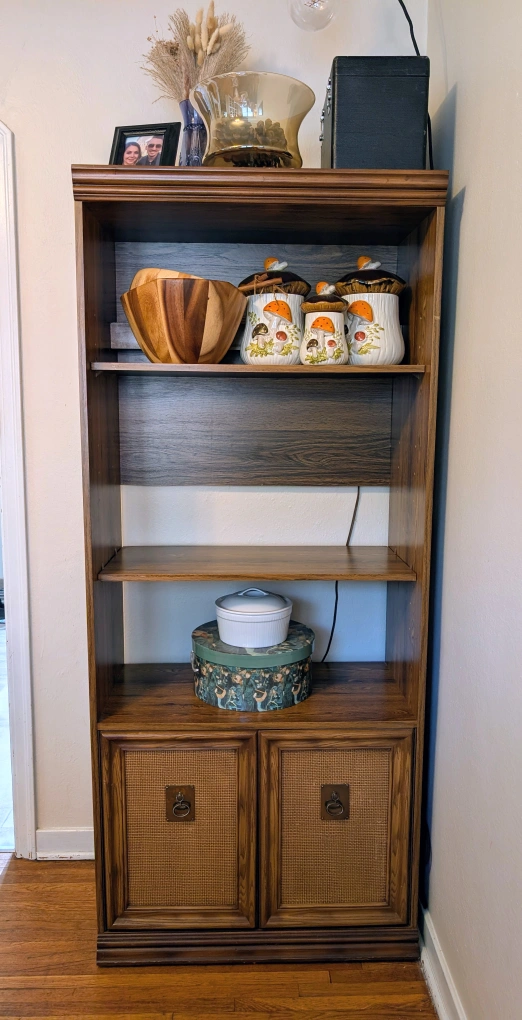 Selling a wooden bookcase with a cabinet at the bottom. It's a great piece for storing books and displaying items. The cabinet doors have a unique woven texture, adding a touch of character to the piece. It's in good condition and ready for a new home! Back light on the top shelf. 72" tall 15.5" deep 30.5" wide