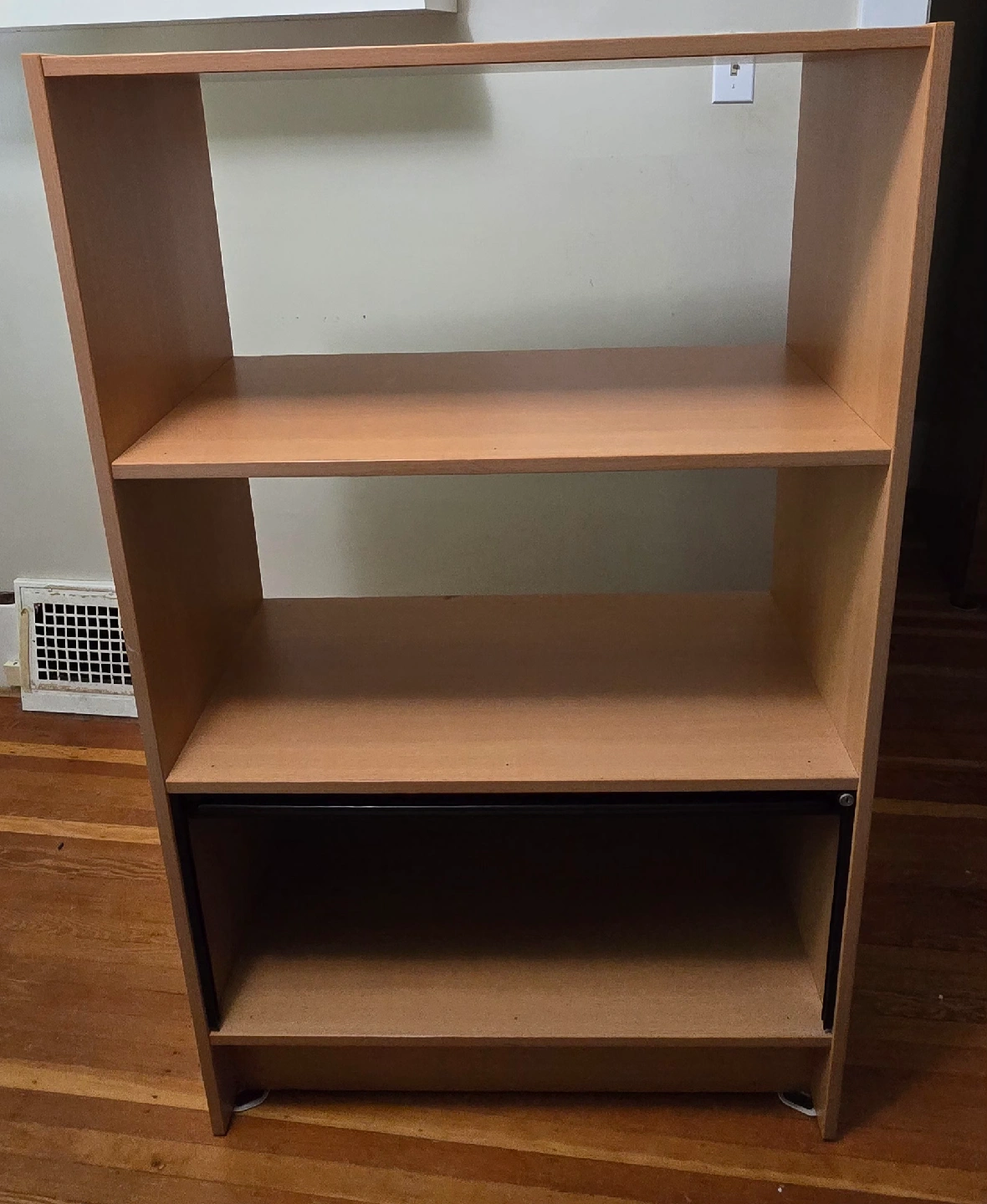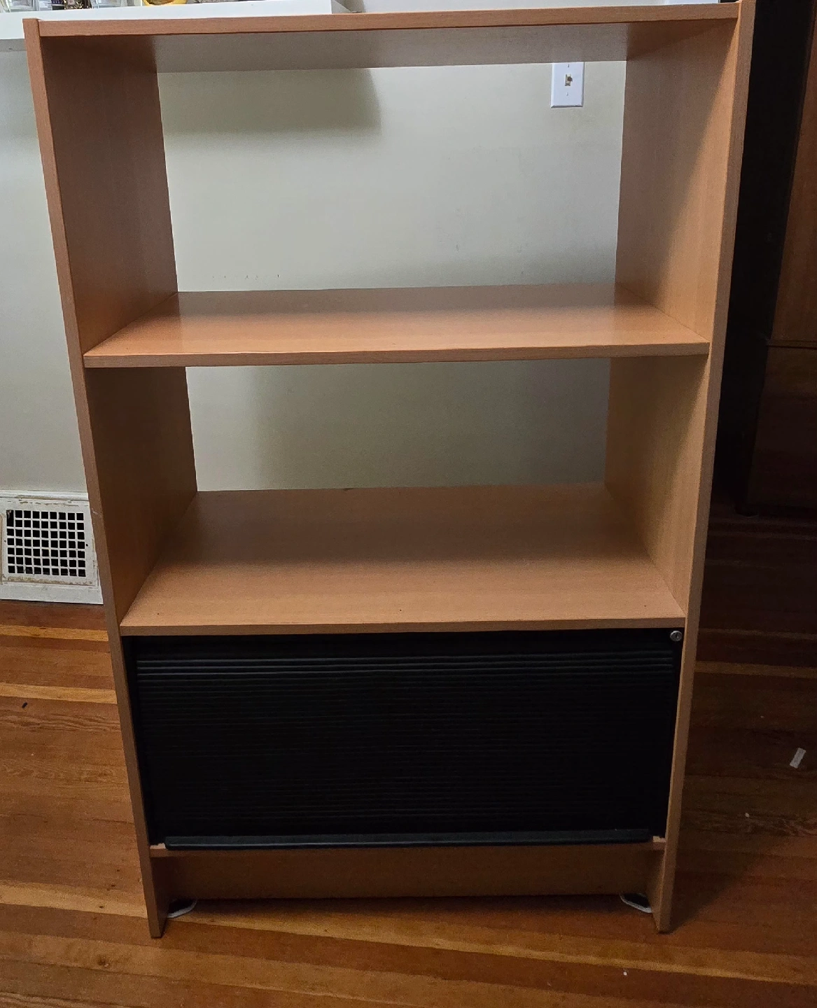 Here's a sturdy wooden bookcase that's perfect for organizing your books or displaying your favourite items. It features a sliding door at the bottom for concealed storage. It's in great shape and ready for a new home. Pick up Only