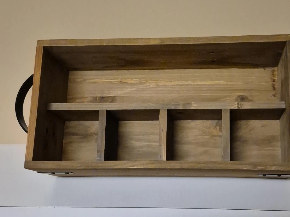 10Selling a wooden box organizer. It features a rustic design with multiple compartments, perfect for storing small items or displaying decor. The box has a handle on one side for easy carrying