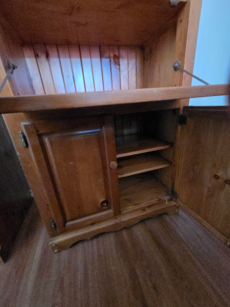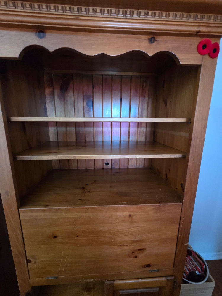 Selling a wooden cabinet with shelves. It's in good condition and would be great for storage or display. The cabinet features a door on the bottom half and open shelving on the top. Perfect for adding some charm to your home!