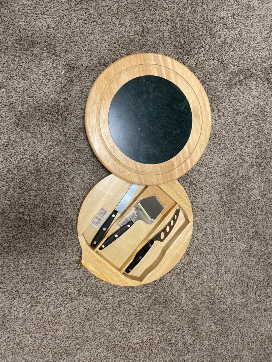 65Selling a wooden cheese board with a set of cheese knives. It includes a round wooden board with a dark green centre and three cheese knives with black handles. Perfect for your next get-together!