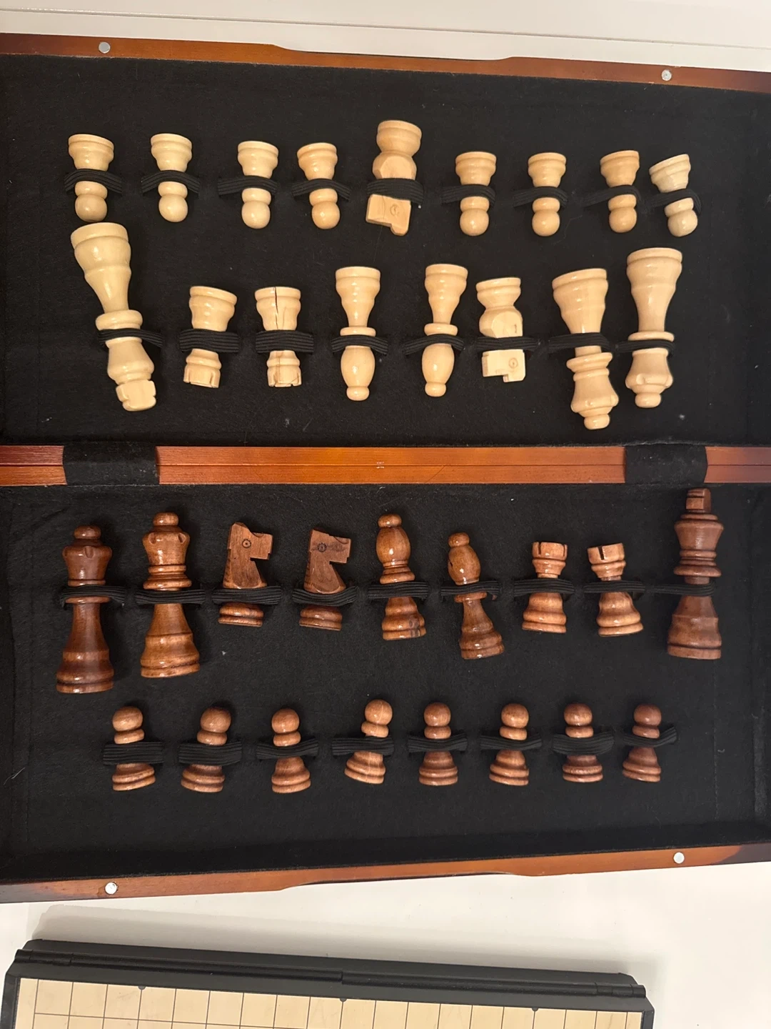 10Selling a wooden chess set! It comes with all the pieces and a folding board for easy storage. Perfect for game nights!