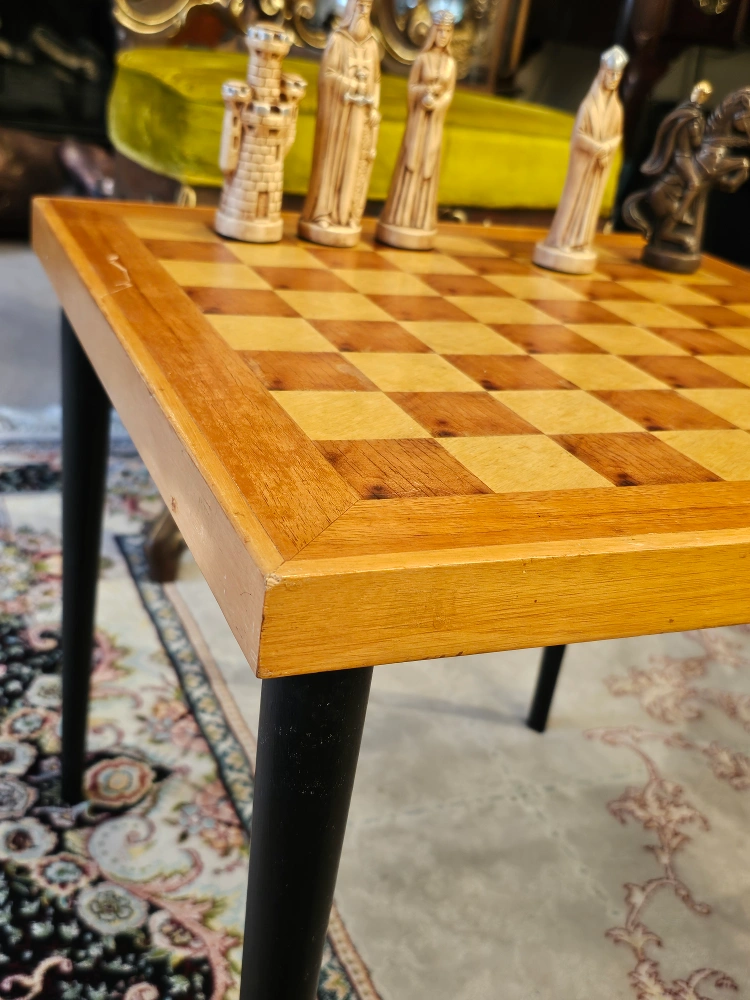10Selling a charming wooden chess table! It features a classic checkerboard pattern and sturdy black legs. The table appears to be in good condition and would be a great addition to any game room or living space