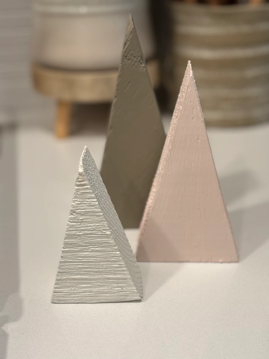 76Here's a set of three wooden decorative triangles! They come in varying sizes and neutral colours, perfect for adding a touch of modern simplicity to your home decor