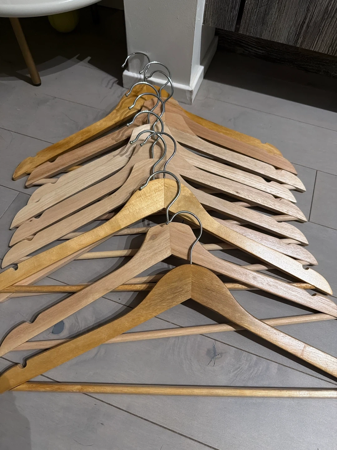 Selling a set of 10 wooden clothes hangers. They are in good condition and ready to help organize your closet!