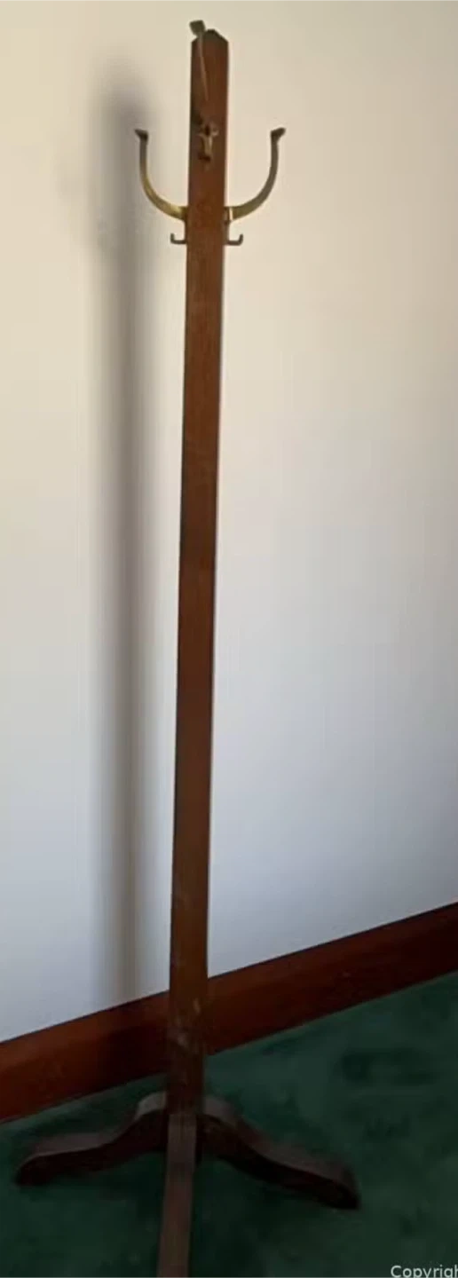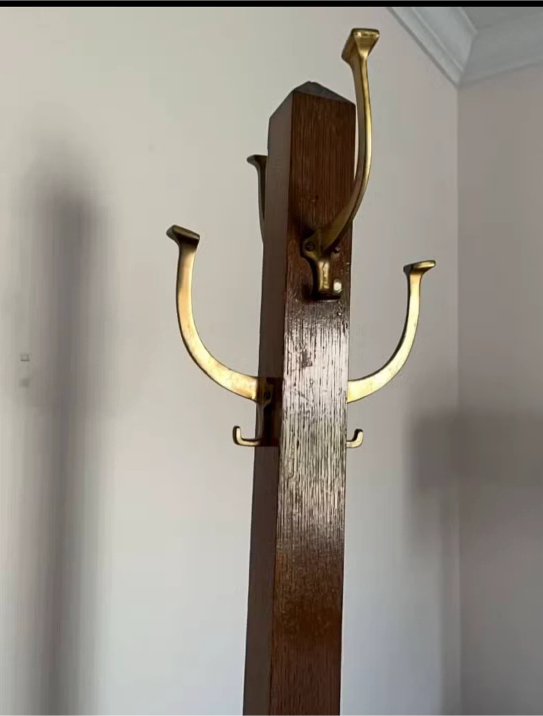 97Selling a wooden coat rack stand. It's a simple and functional piece for organizing your coats and hats. The rack is made of wood with a dark brown finish and has brass-coloured hooks. It's sturdy and ready to use in your entryway or closet