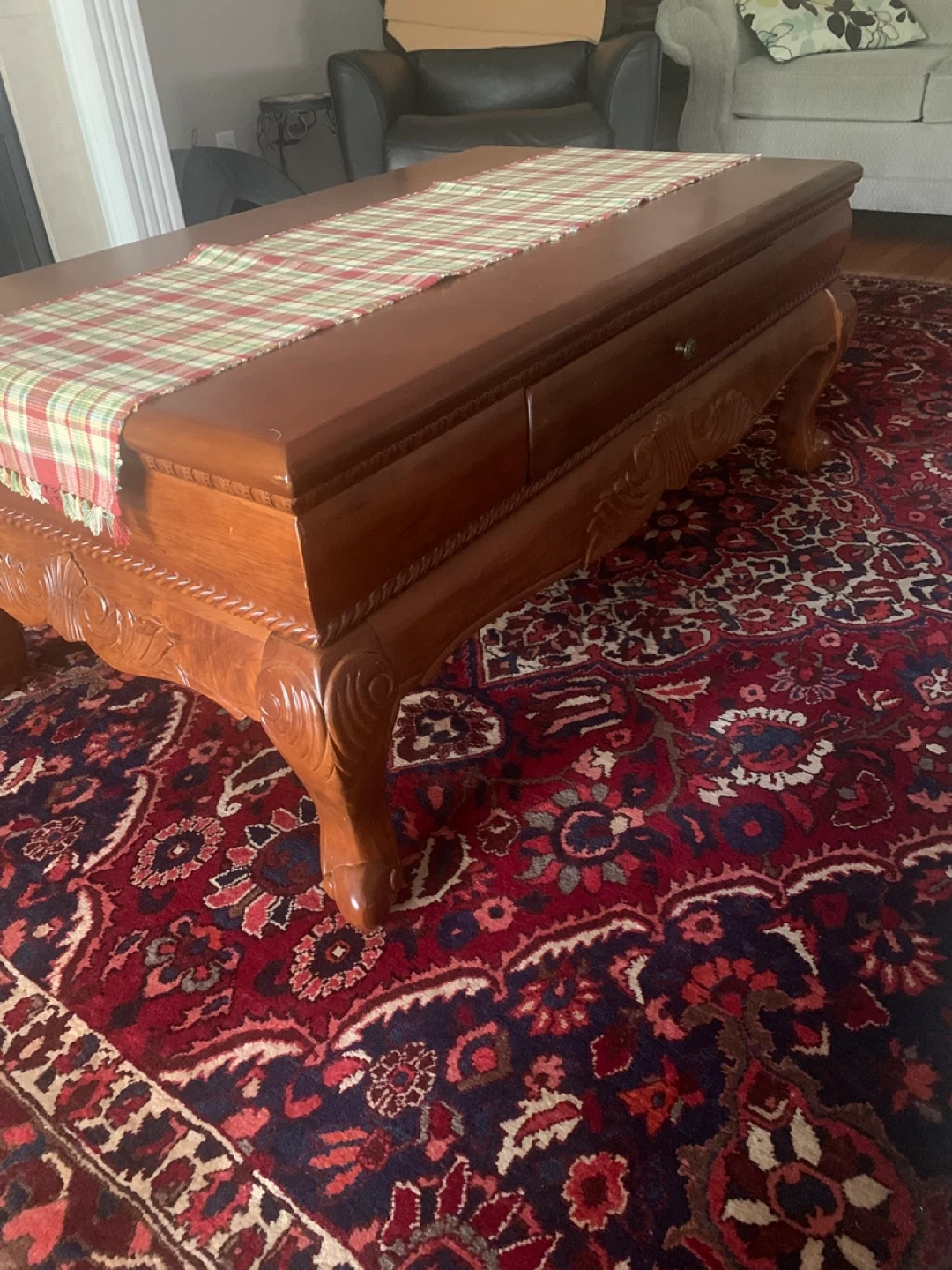 A beautiful wooden coffee table with ornate detailing on the legs. It's a lovely piece that would add a touch of elegance to any living room. Comes with two end tables with inlaid design. Heavy solid wood . Coffee table has inlaid design and storage drawer. Will sell set or separate.