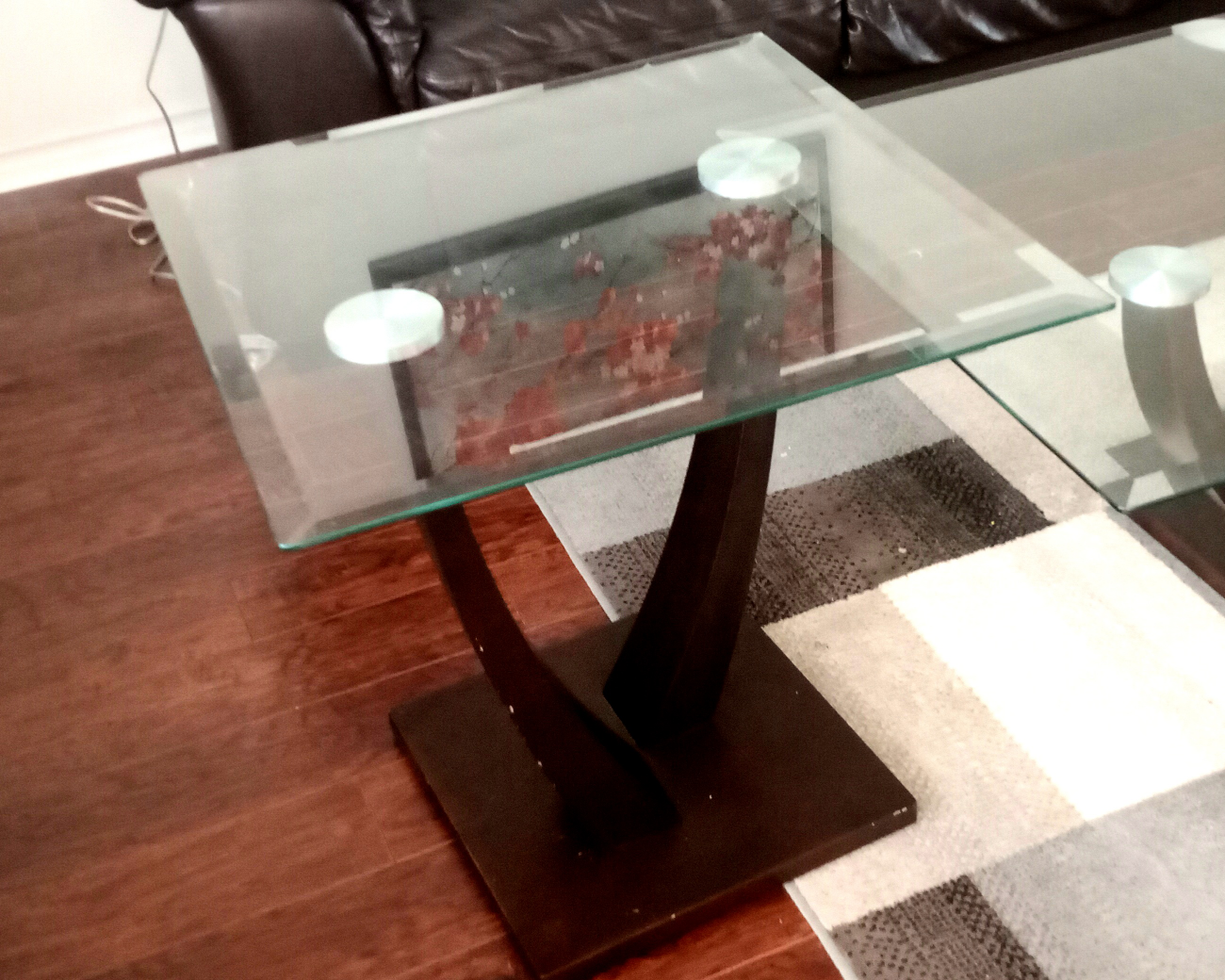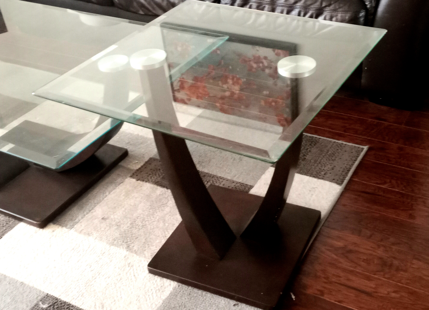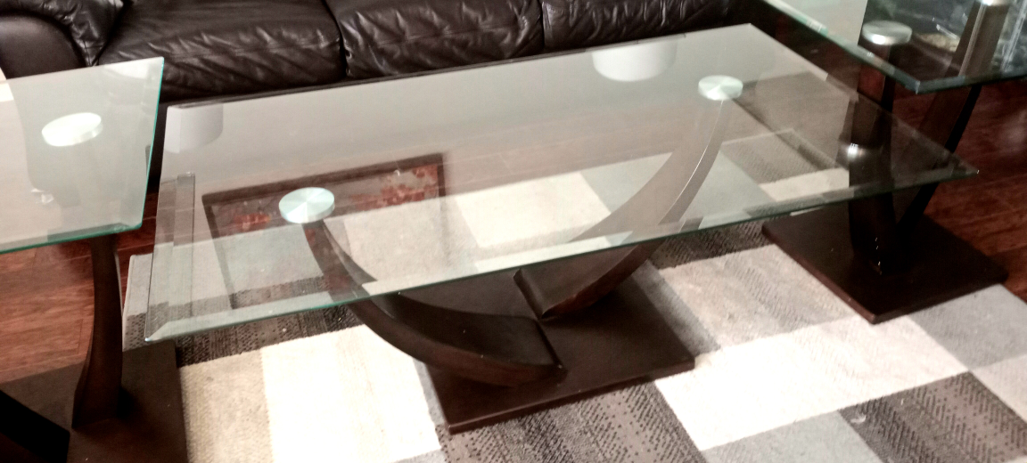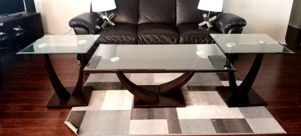 90Wooden coffee table set with glass top in very good condition is now available. Purchased from BRICK. Dimension of coffee table: L/W/H= 48/ 28/18 inch, Dimensions of end tables: L/W/H= 23/23/23 inch. Pay in cash or e-transfer only. Pay at the picup site.