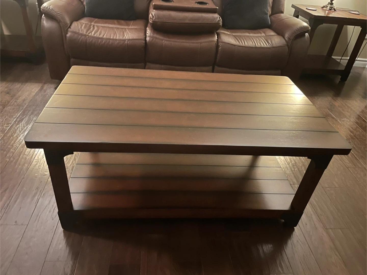 Selling a lovely wooden coffee table and two end tables with a shelf underneath for extra storage! It's in great shape and would look perfect in any living room. The wood has a nice, warm tone. Coffee Table: 46" x 26" x 21” End Tables: 26" x 20" x 25"