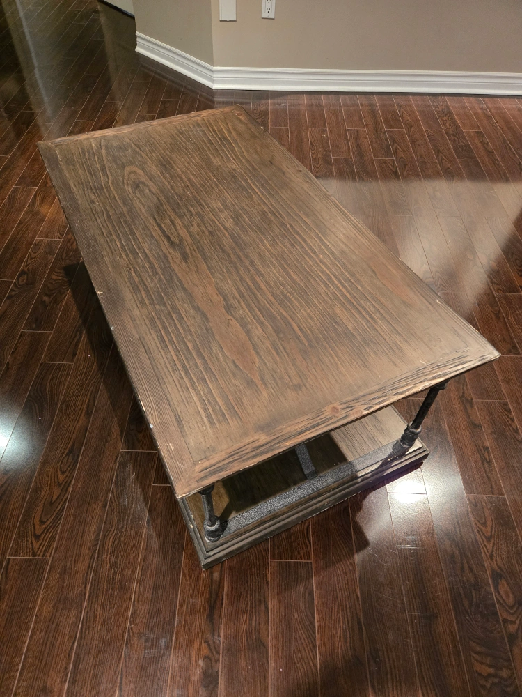 75Selling a coffee table with a shelf underneath! It's a great piece to add to your living room. The table is made of wood and has a rustic look. It has some signs of wear and tear, but it's still in good condition and ready for a new home