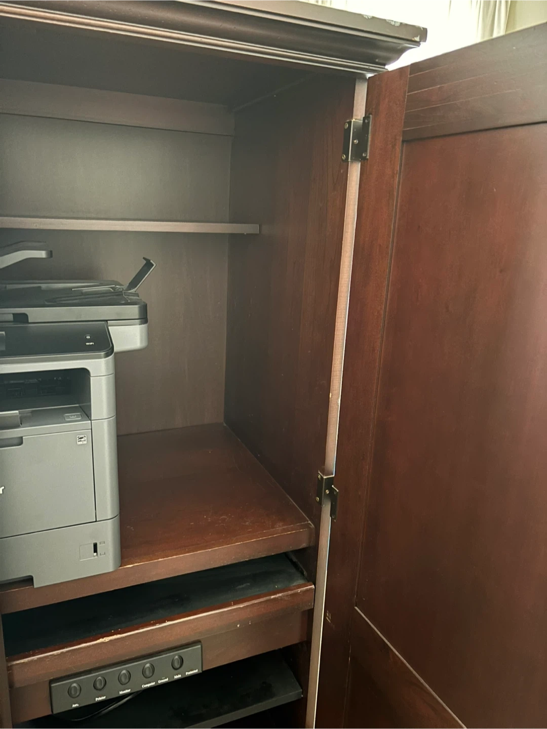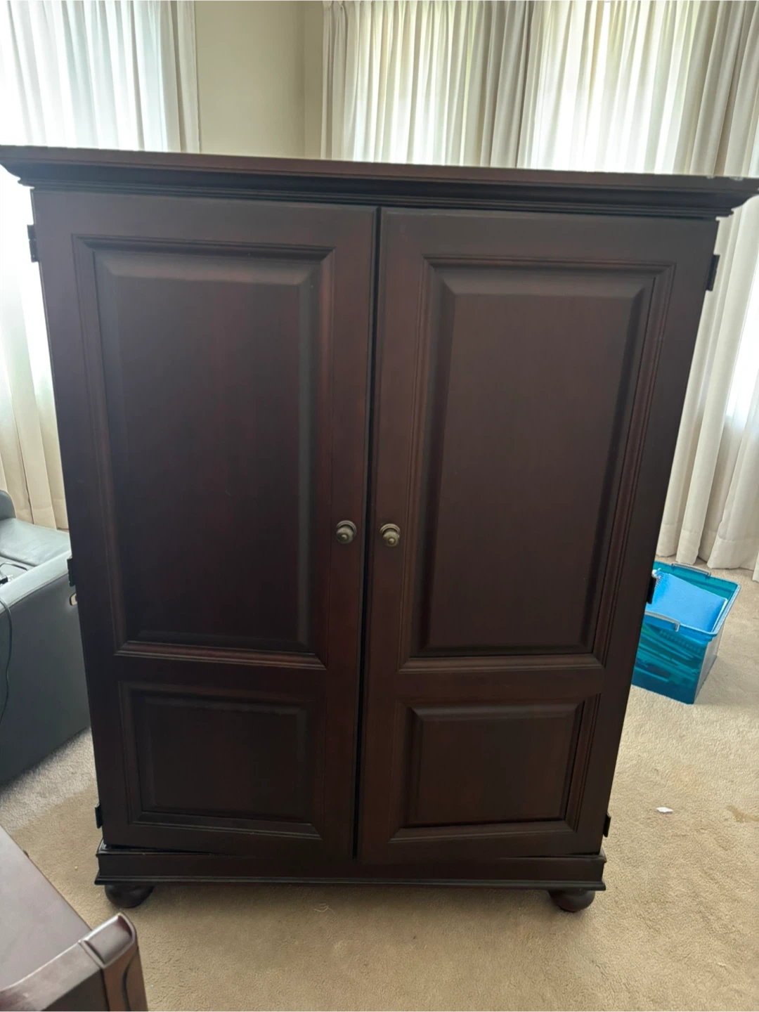 131Dark brown wooden armoire. Sturdy Keyboard tray. It has shelves inside for printer, monitor and has a wire organization. Great for storage or a television or gaming station.