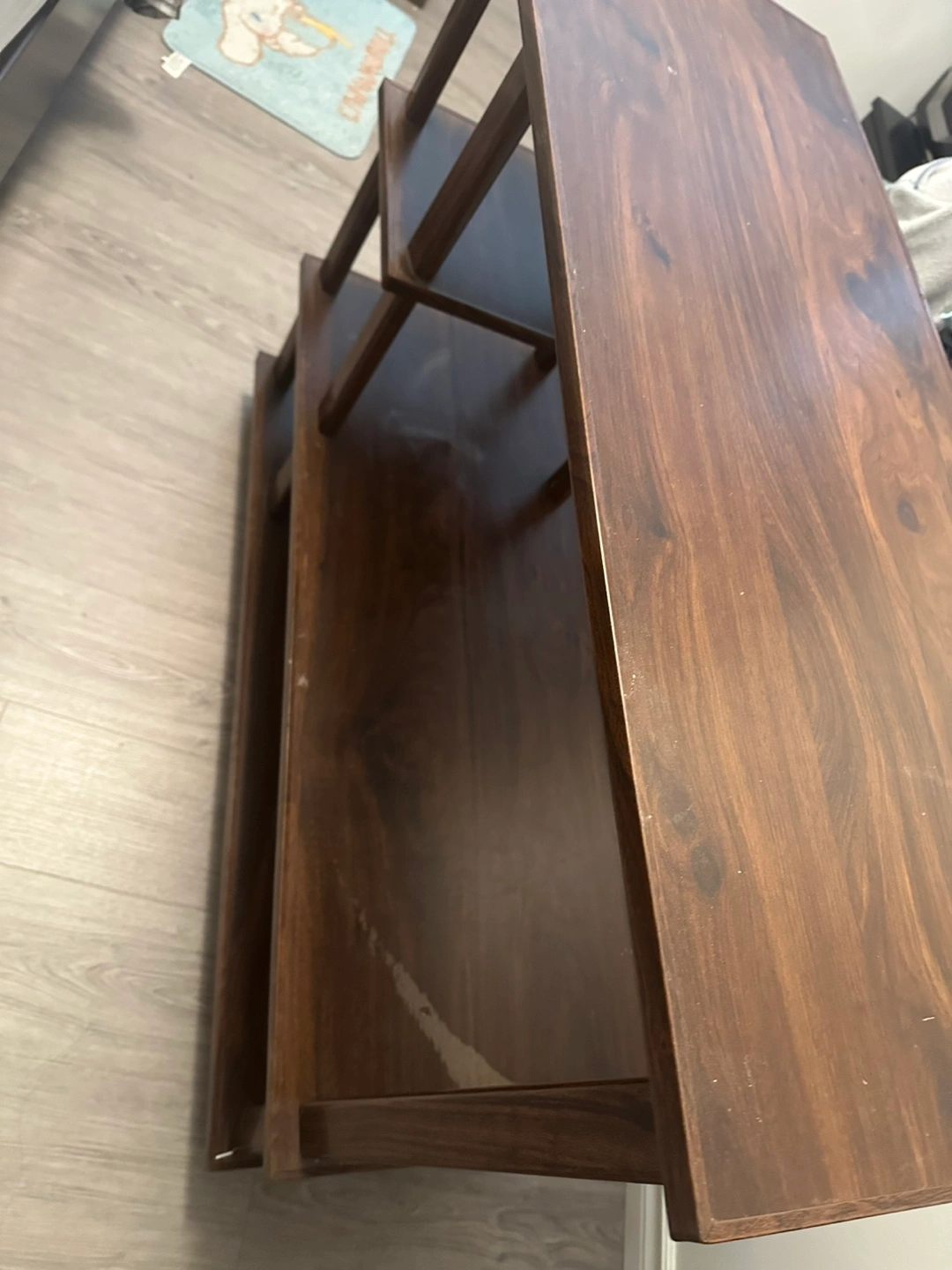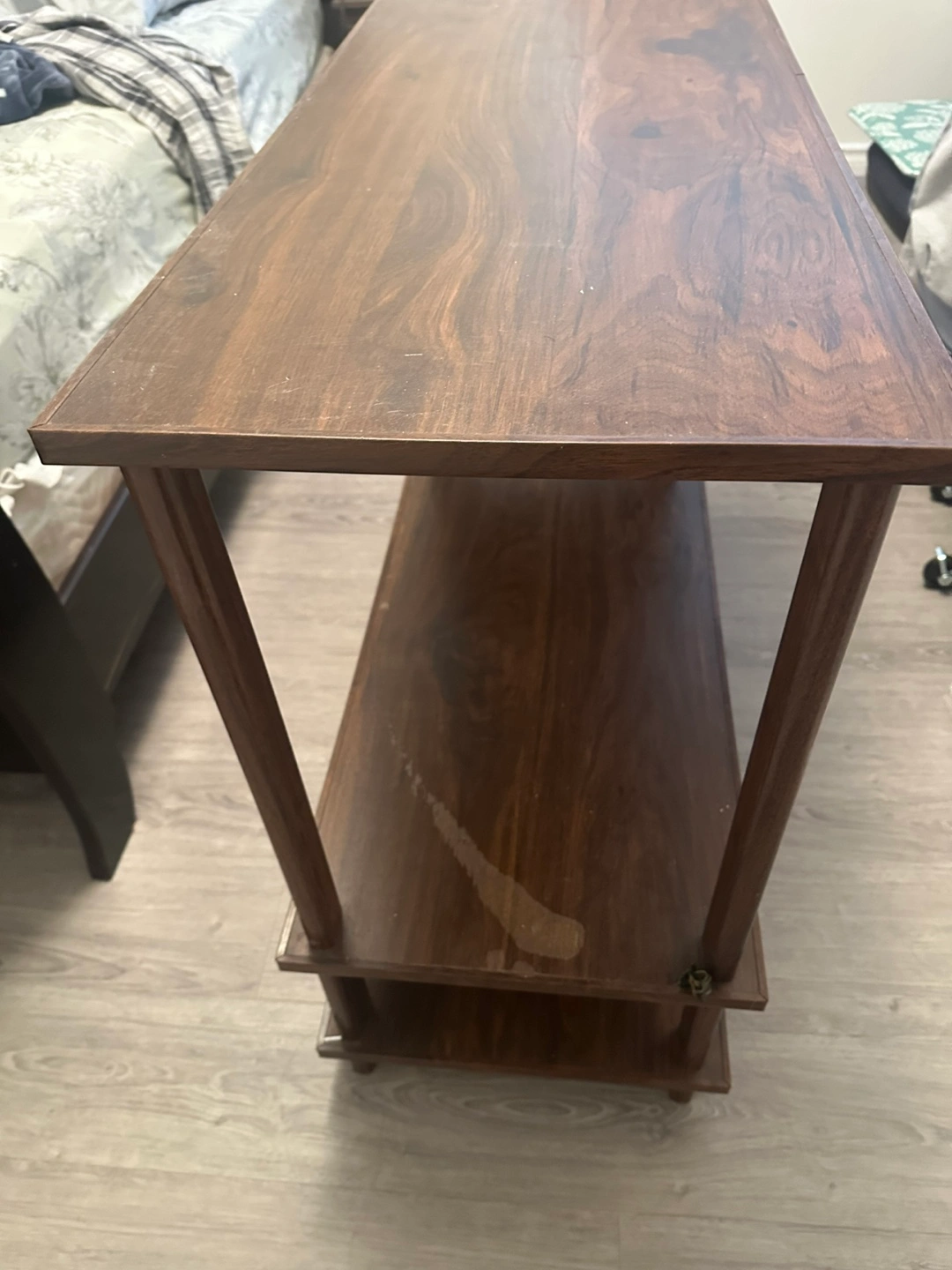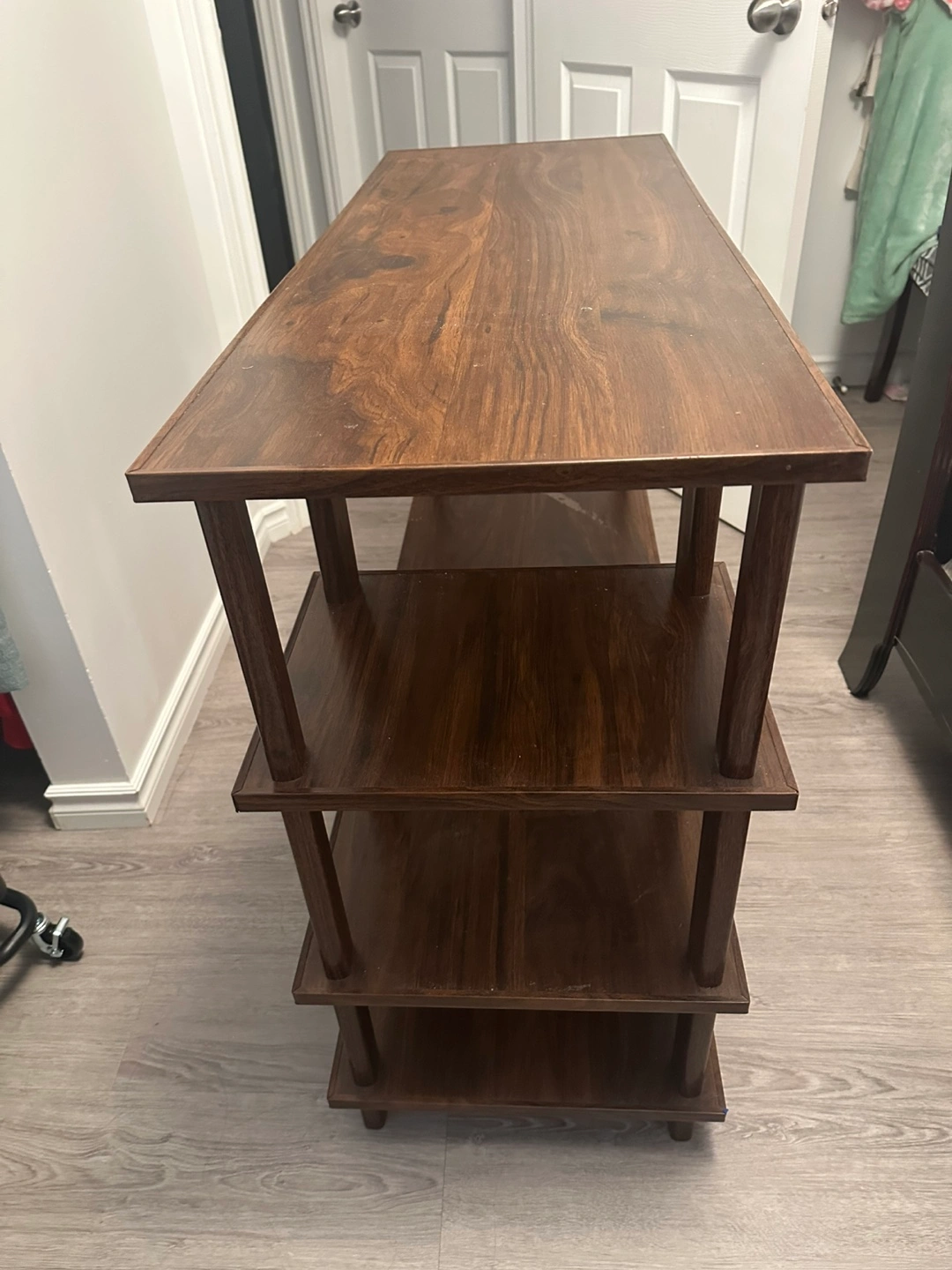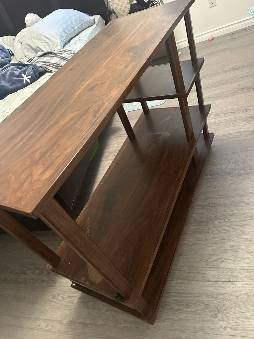 51Selling a wooden console table. It has a few shelves for storage or display. There are some signs of use, as pictured, but overall it's in good condition! Size is 1 1/2’ x 3’ x 2 1/2 Thanks for ciewing.