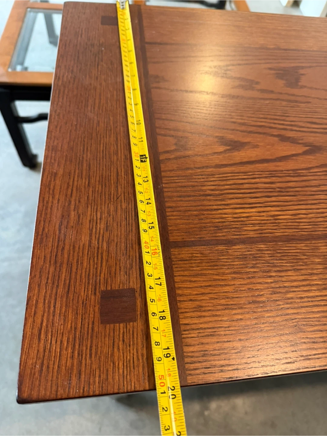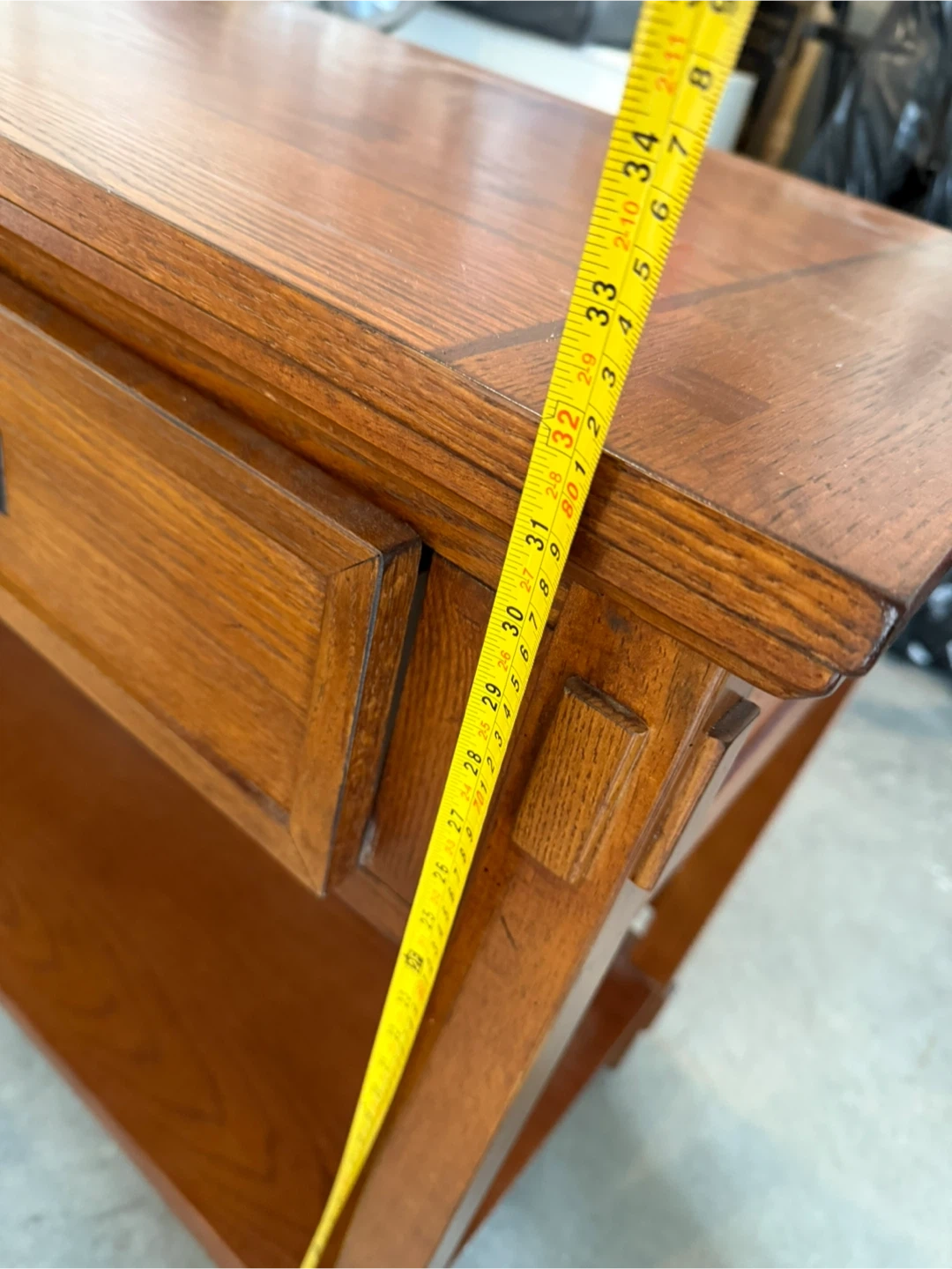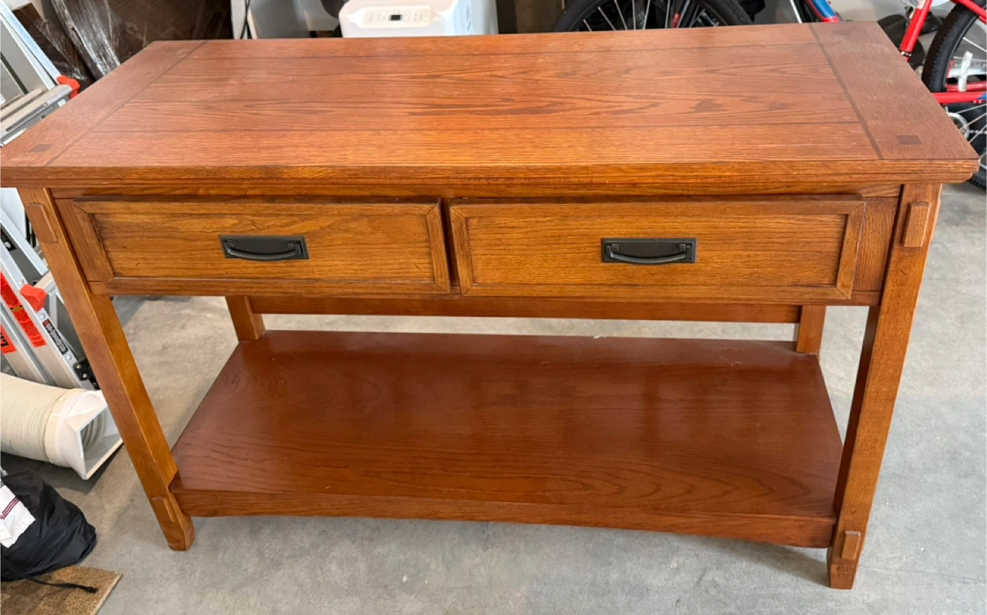 I'm selling a lovely wooden console table! It features two drawers and a lower shelf for extra storage or display. The table measures approximately 51 inches in length and 33 inches in height. It would be a great addition to any entryway or living room!