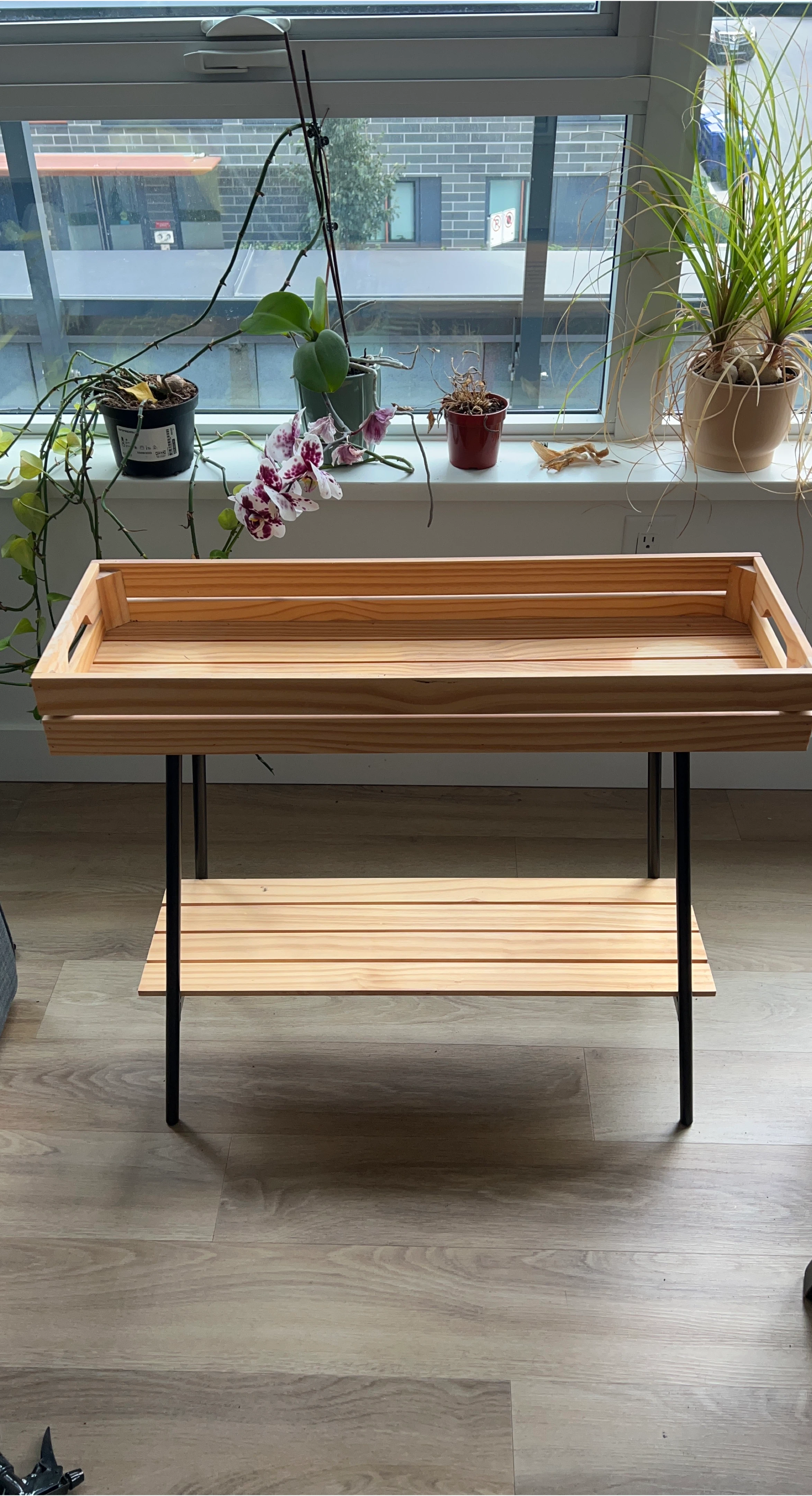 Here's a wooden console table with a shelf underneath, perfect for an entryway or living room. It features a light wood finish and black metal legs. It's in great condition and ready for a new home!