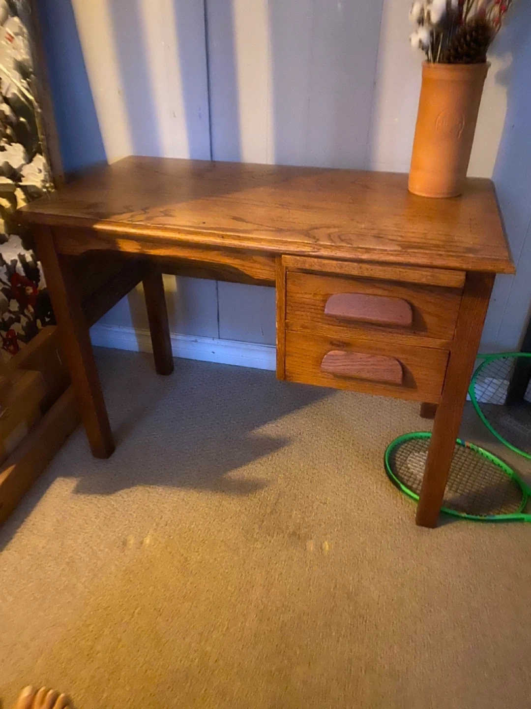 28Selling a lovely wooden desk that would be perfect for a home office or study space. It features a warm, natural wood finish and has a couple of drawers for storage. It's in good condition and ready for a new home! Solid oak 25” tall