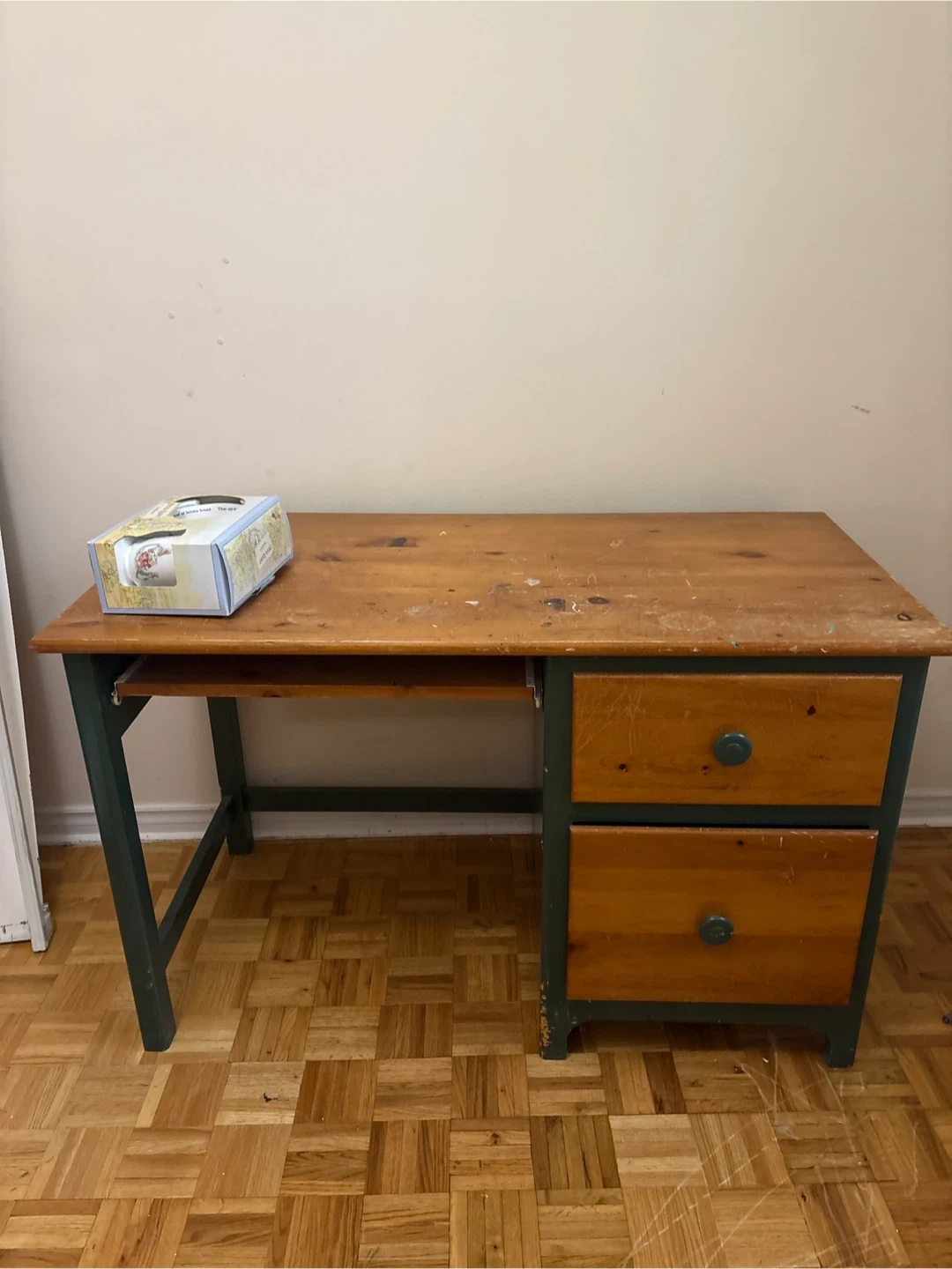 Selling a wooden desk that has a keyboard tray and drawers. It shows some signs of wear and tear, but it's still quite functional. Perfect for a home office or student space